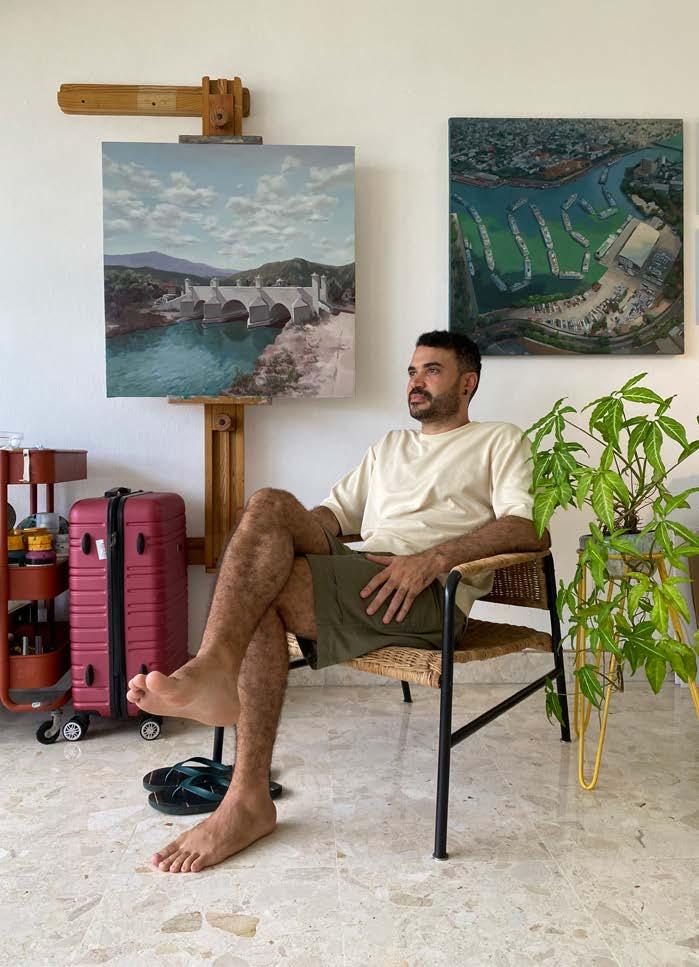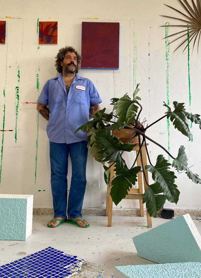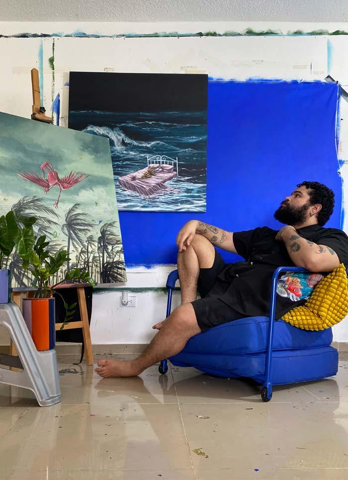 That room is inside the apartment where he lives —the first home he ever owned— “and maybe that’s what has given me a sense of calm and belonging,” he says. In that refuge he keeps his mirror, his bed, an easel and his desk—his supposed official studio at his architecture firm remains untouched and spotless. Stripped of his performative mask, every one of his artistic