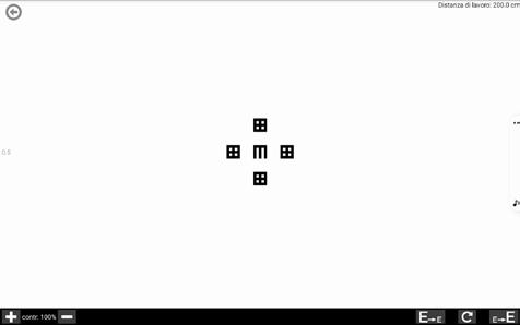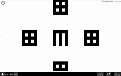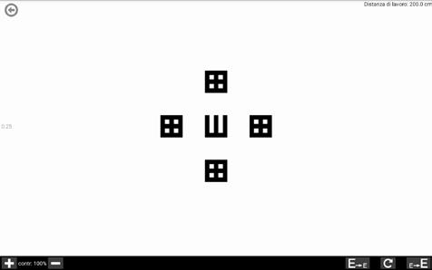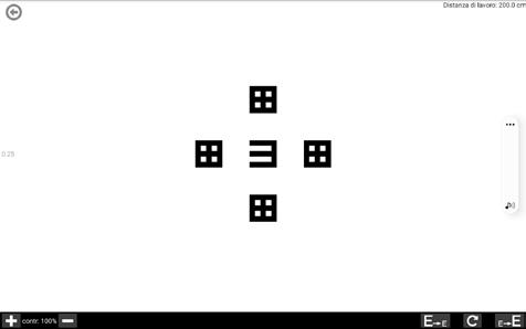 Il Test visualizza sullo schermo una sola mira: la E di Snellen, la quale ha un orientamento casuale che dovrà essere indicato dall’esaminato.