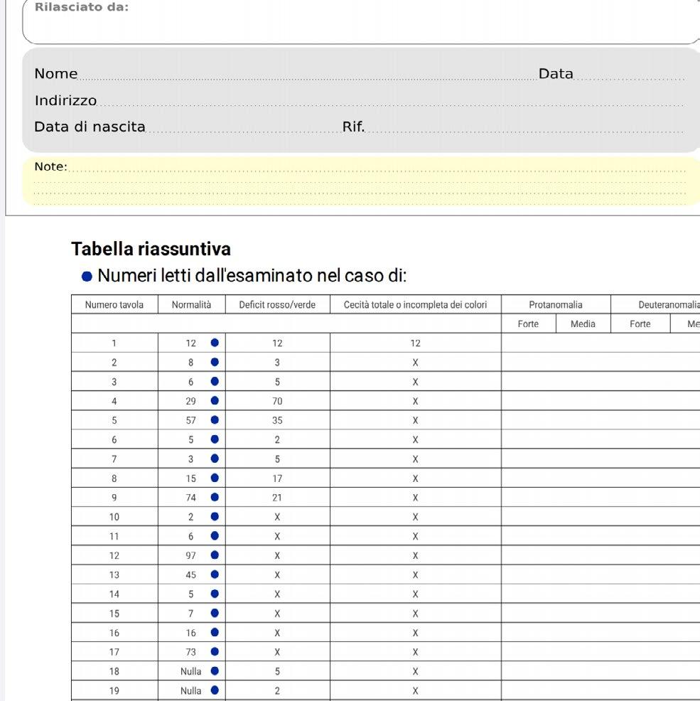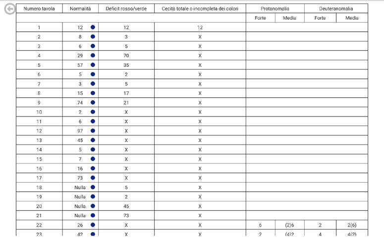 Tabella riassuntiva che riporta le risposte dell’esaminato e che potrebbe evidenziare la cecità totale o incompleta dei colori e il deficit di visione dei colori rosso verde.