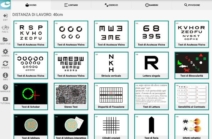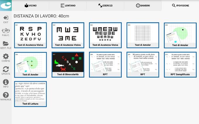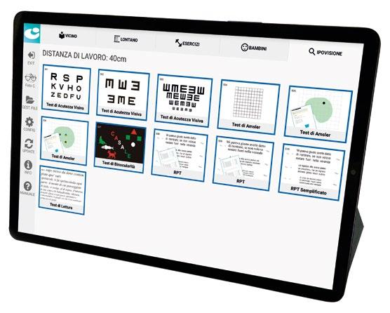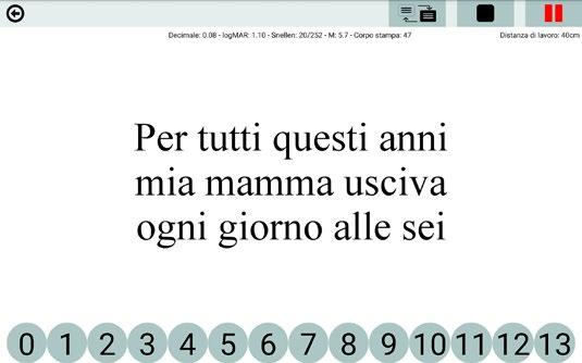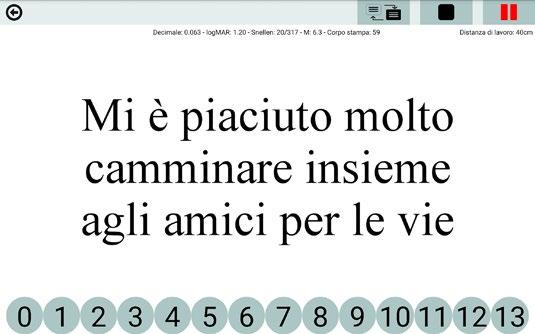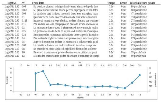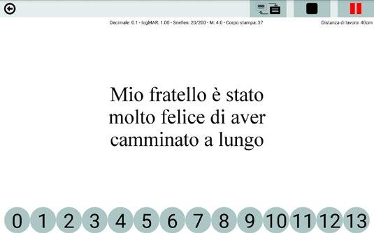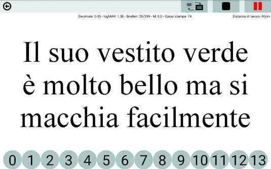 Il test mette in relazione la velocità di lettura con l’acutezza visiva, fornendo risultati che potranno essere salvati e stampati.