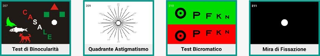 Test di binocularità, quadrante astigmatismo, test bicromatico, mira di fissazione.