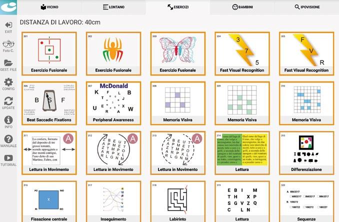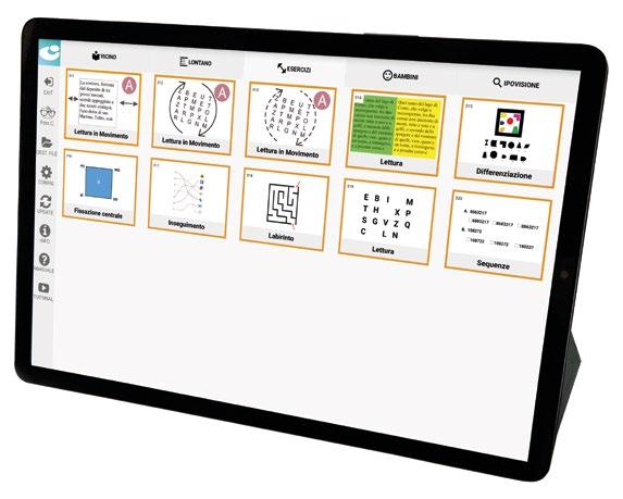 Varieserciziperallenareimovimenti oculari(movimentidifissazione, saccadi,inseguimento,coordinazione oculomanuale)eladiscriminazione dell’immagineutilizzandolavisione eccentrica,migliorandolacapacità visivaedilettura.