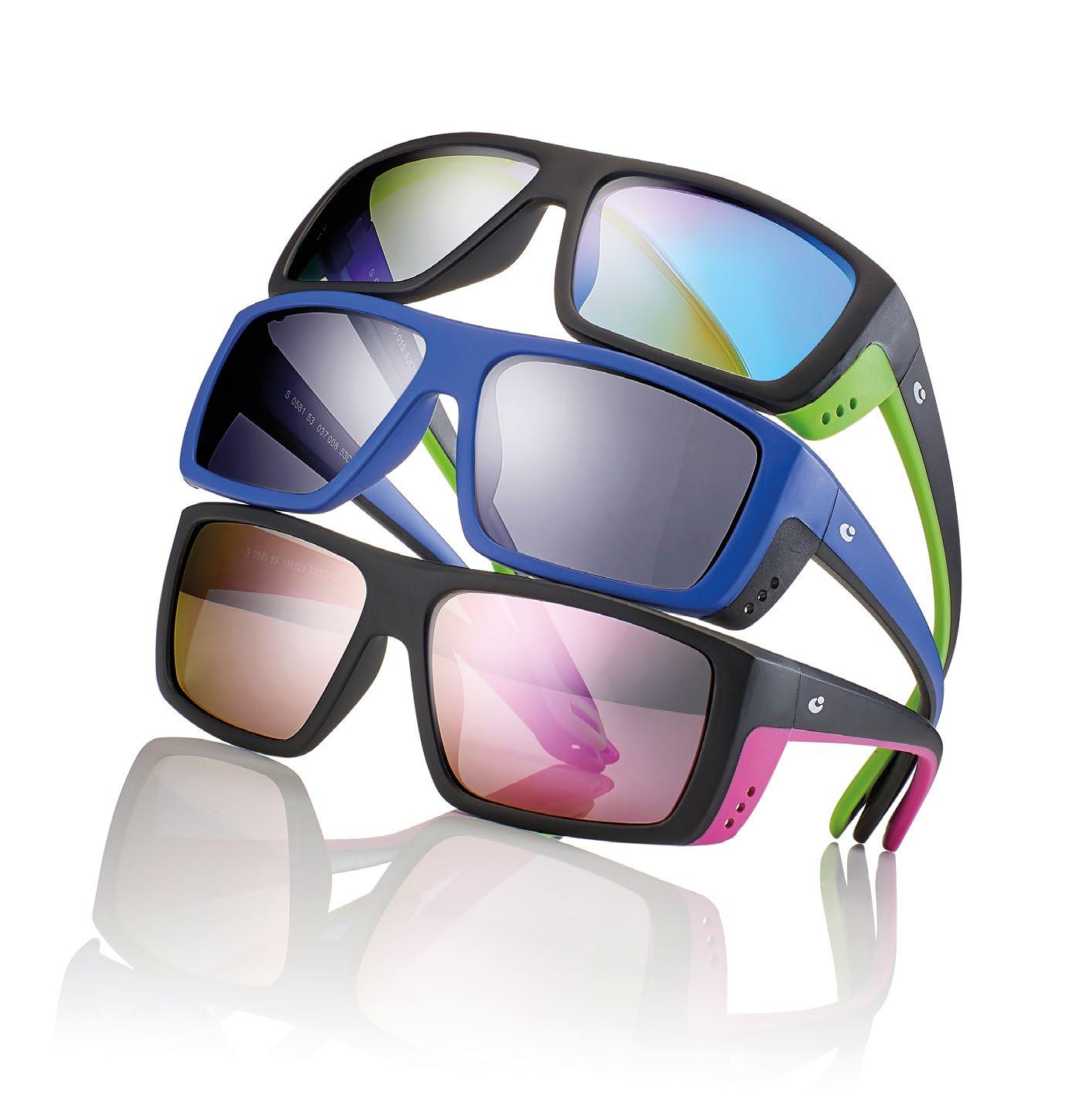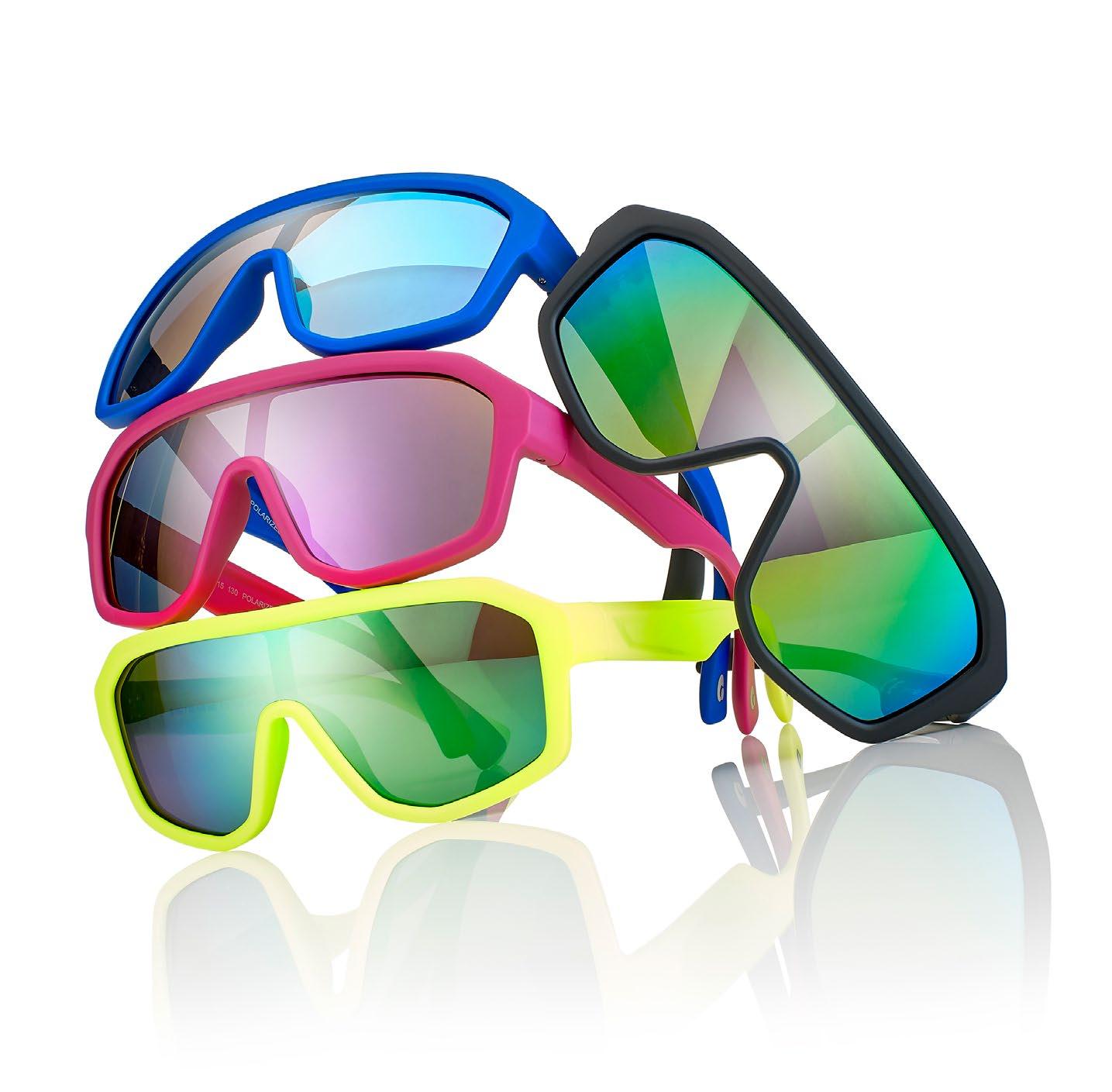 Lightweight, flexible and durable TR90 sunglasses. Wrap-around temples with double injection to increase stability. Impact resistant polycarbonate lenses.
