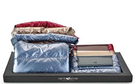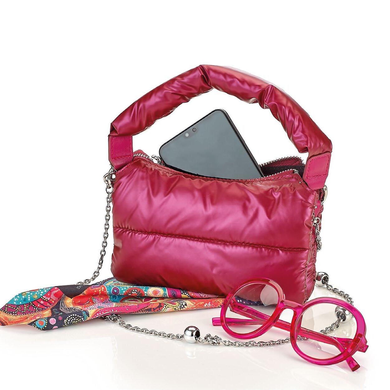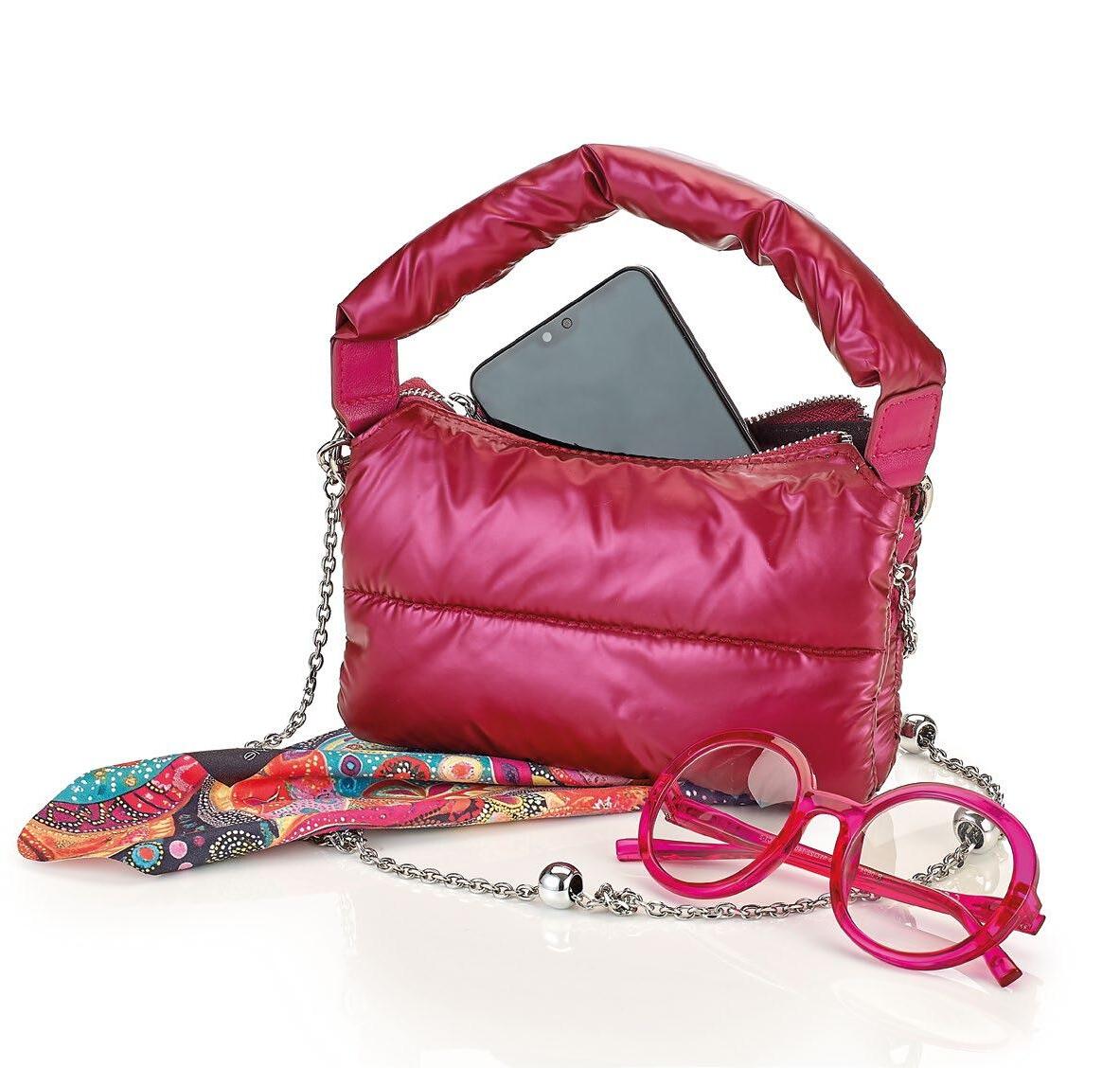 Mini bag with a removable metal strap, made from a ‘puffer’ effect material. It has three compartments. It is ideal for holding eyeglasses, sunglasses and other personal items. A gift idea with style.