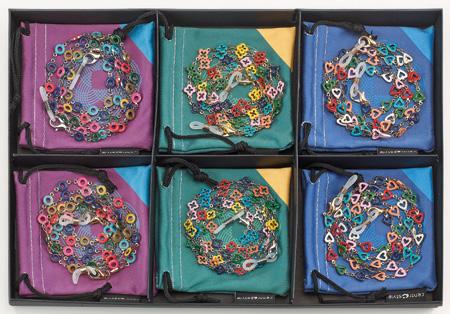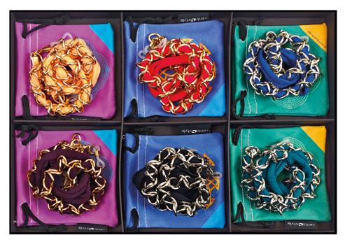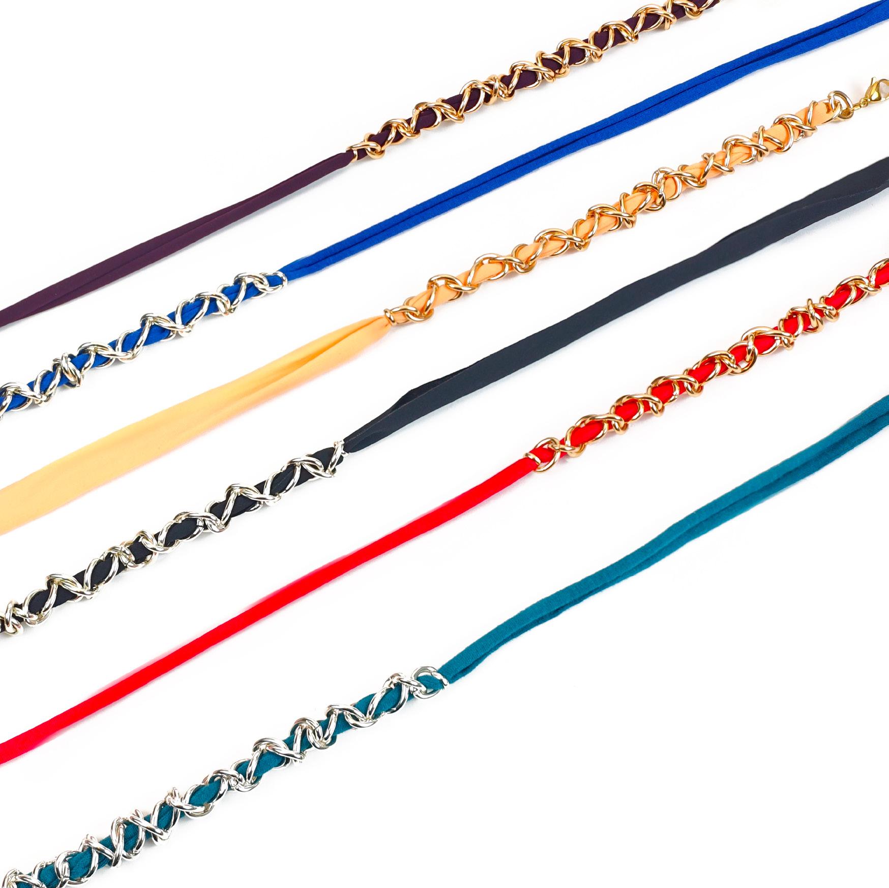 6 catenelle create con la combinazione di nastro colorato e maglie in alluminio, in vassoio espositivo e complete di pochette in microfibra.
