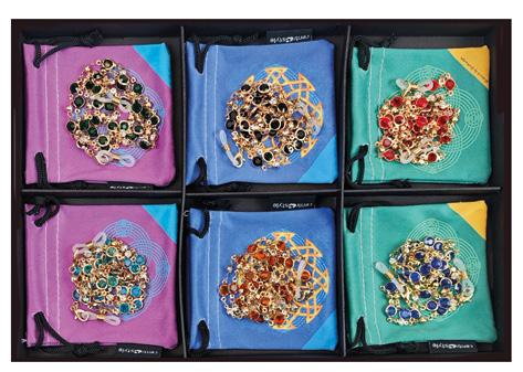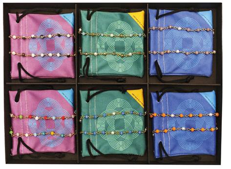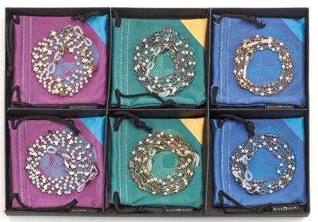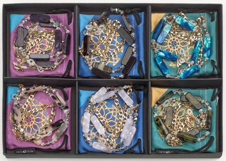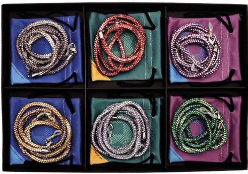 6 catenelle in metallo con cristalli in 6 varianti colori, in vassoio espositivo. Complete di pochette in microfibra. Ref. 74126