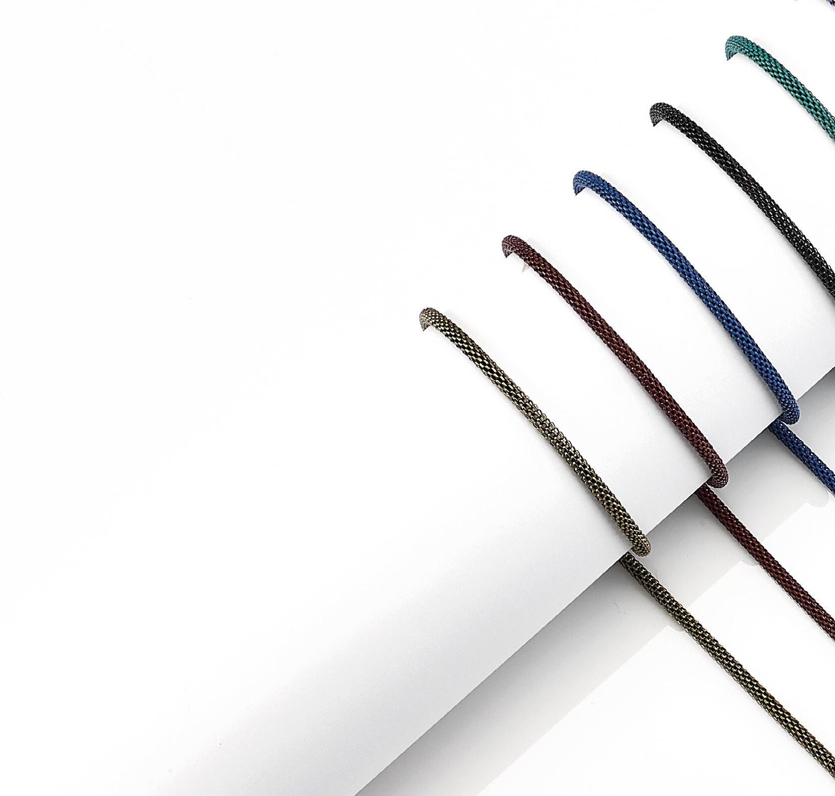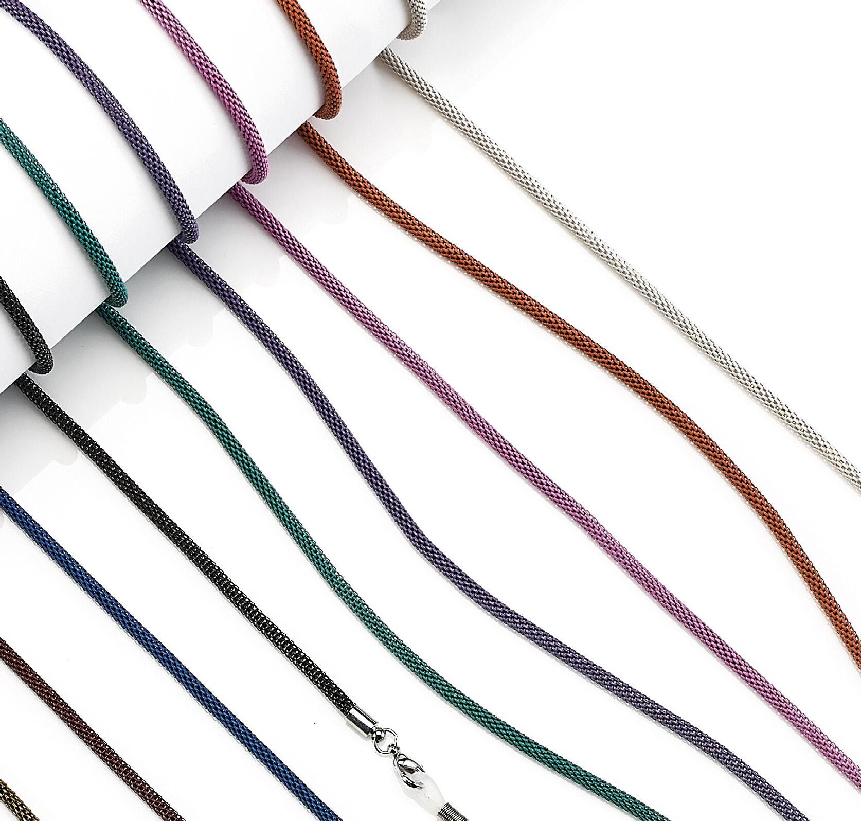 6 catenelle in metallo con effetto dorato, in 6 varianti colori, in vassoio espositivo. Complete di pochette in microfibra.
