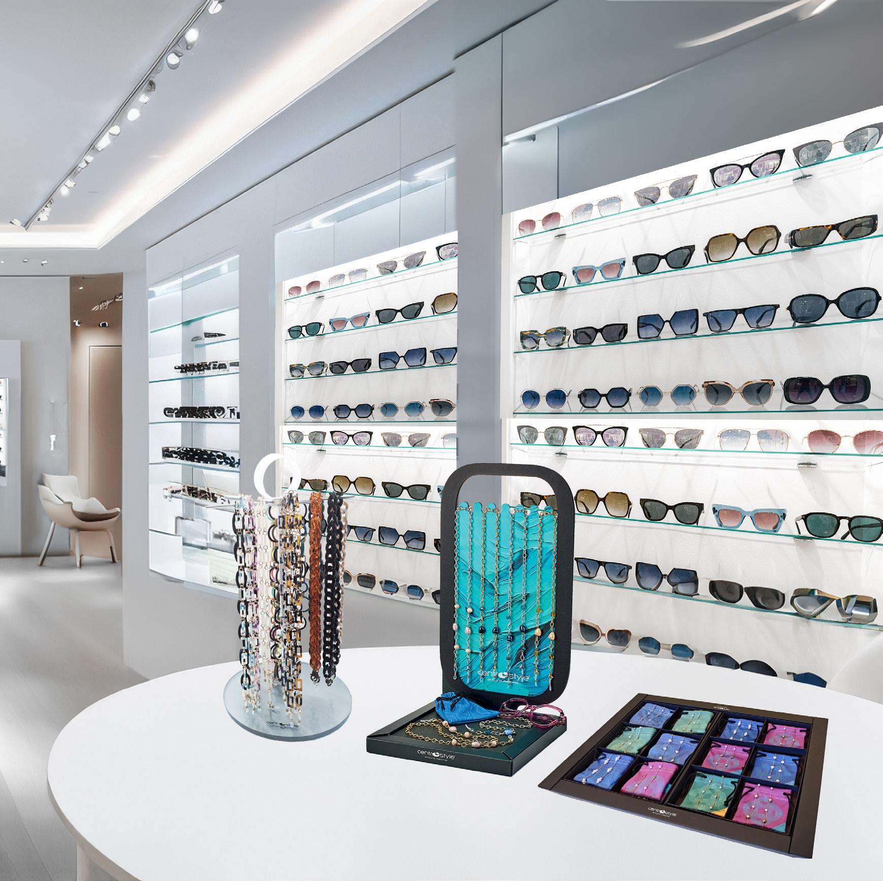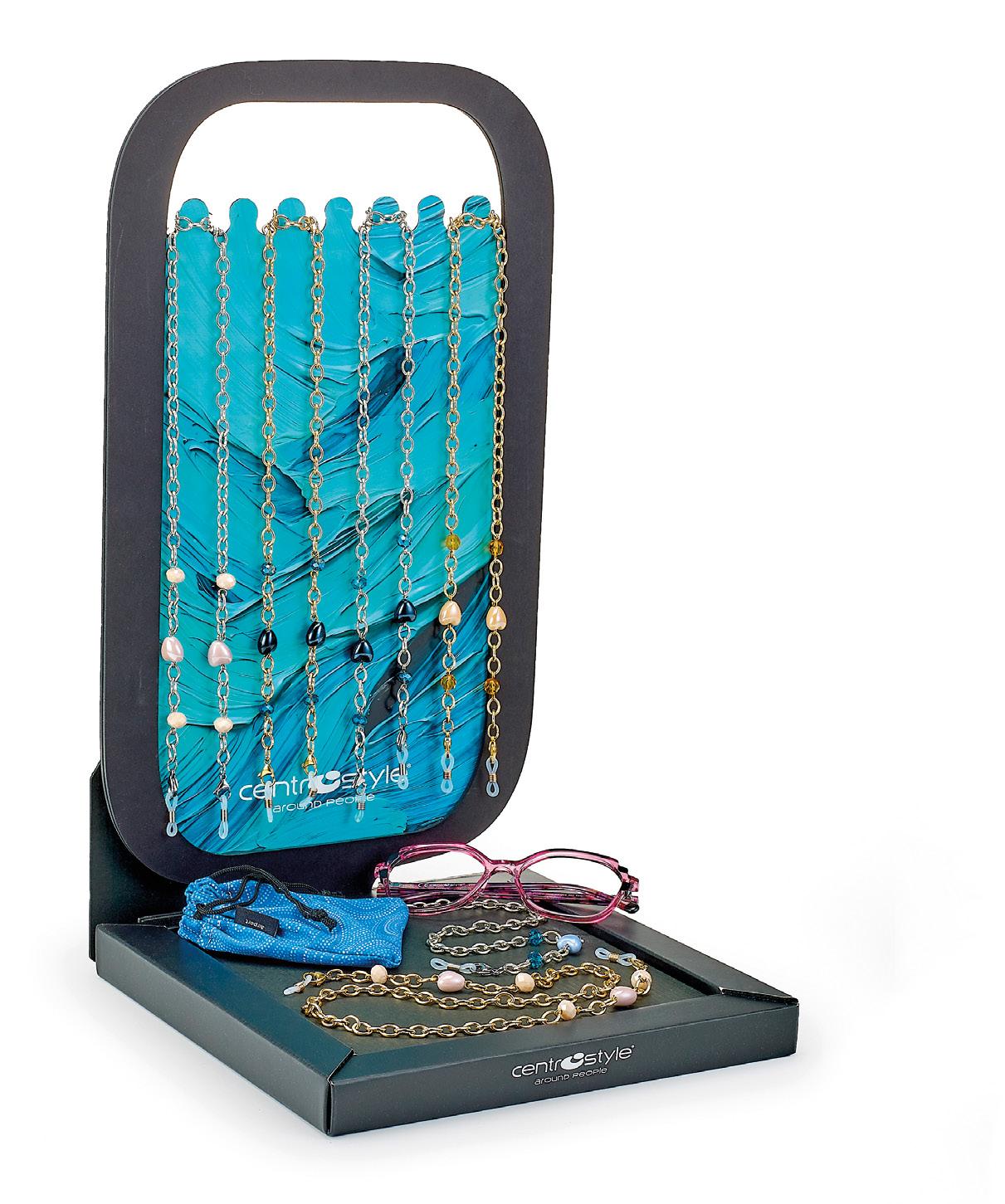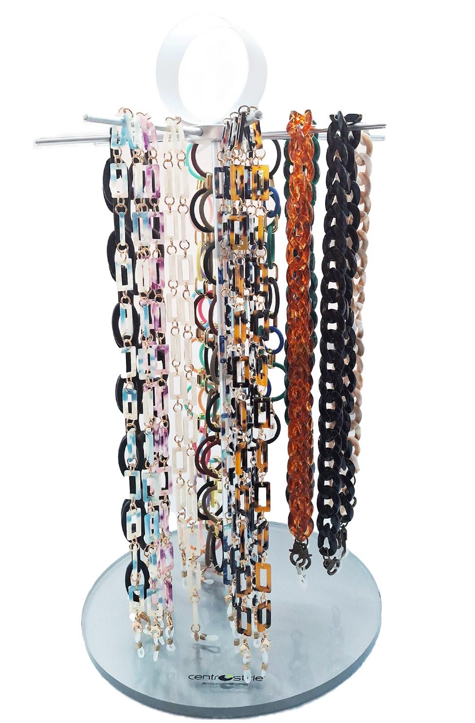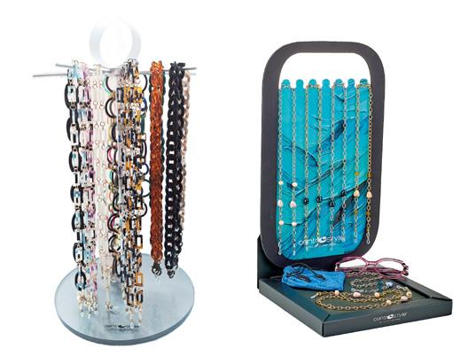 Sistema espositivo per catenelle ideale in vetrina e all’interno del punto vendita. Adatto per dare visibilità a soluzioni per tenere l’occhiale sempre a portata di mano e che diventano anche collane e bracciali, simpatiche idee regalo.