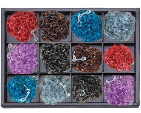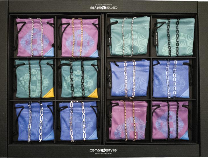 12 catenelle in metallo con 4 diverse maglie in 3 diverse colorazioni, in vassoio espositivo. Complete di pochette in microfibra. Ref.74120