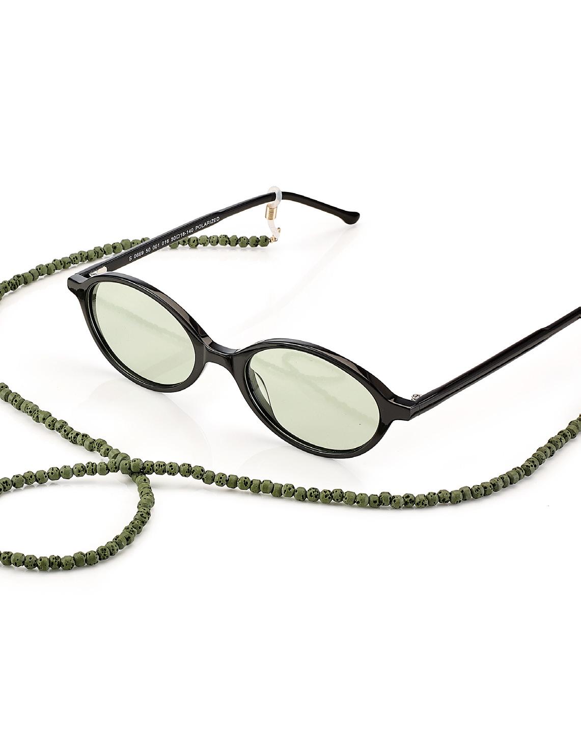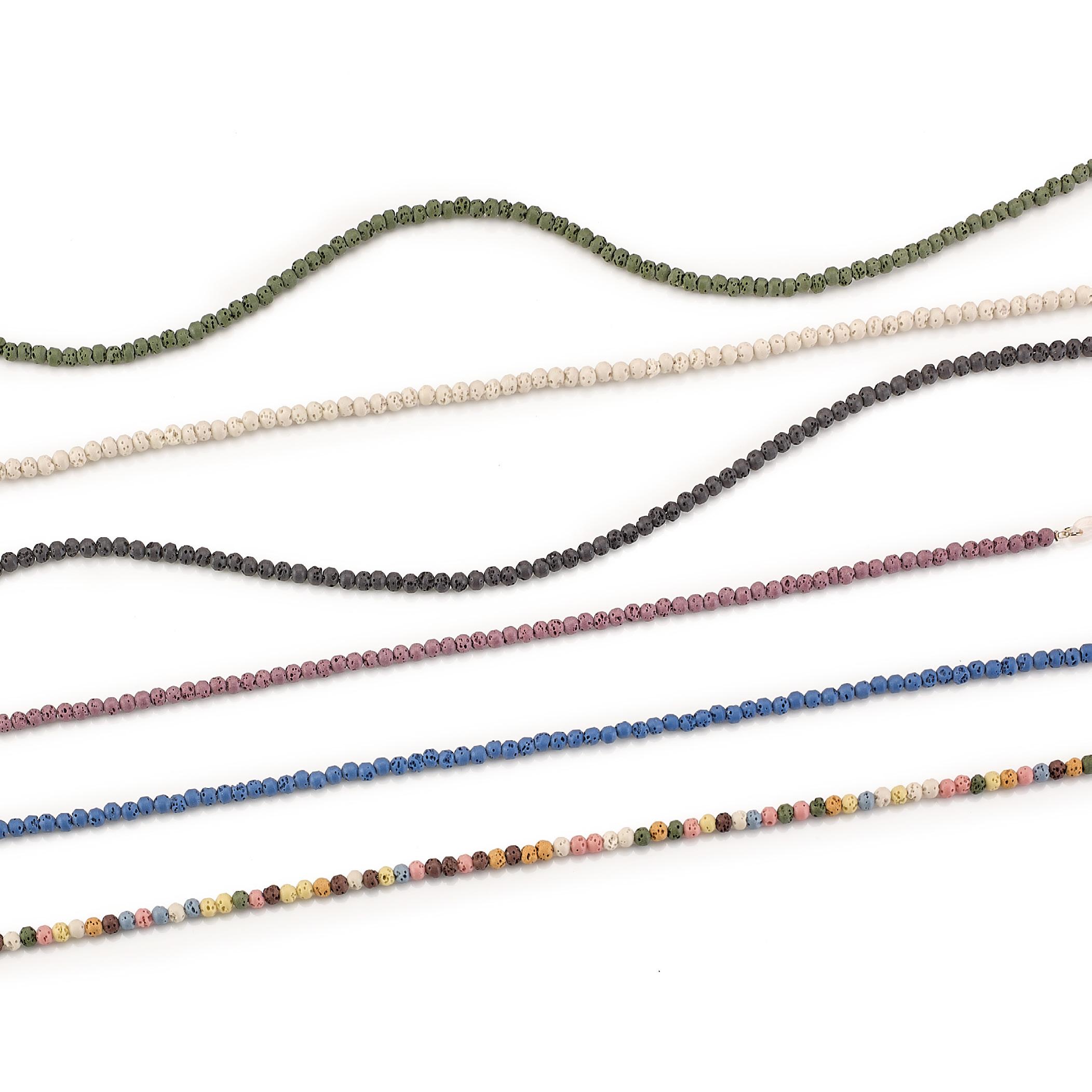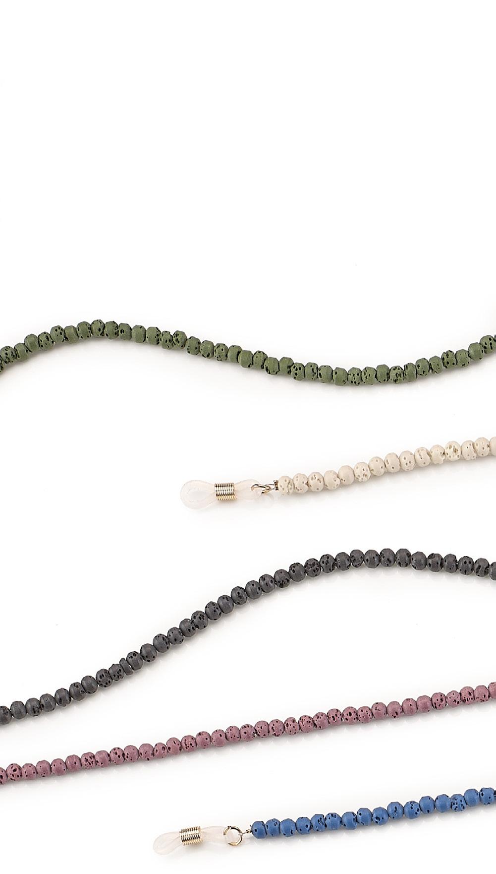 6 catenelle realizzate con perline in pietra lavica, in colori assortiti. Per un look fashion ideale per occhiali da sole e da vista. Complete di pochette in microfibra. Ref. 74600