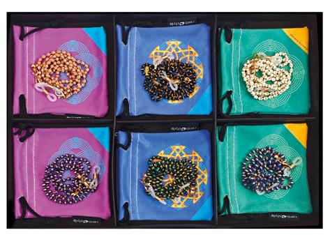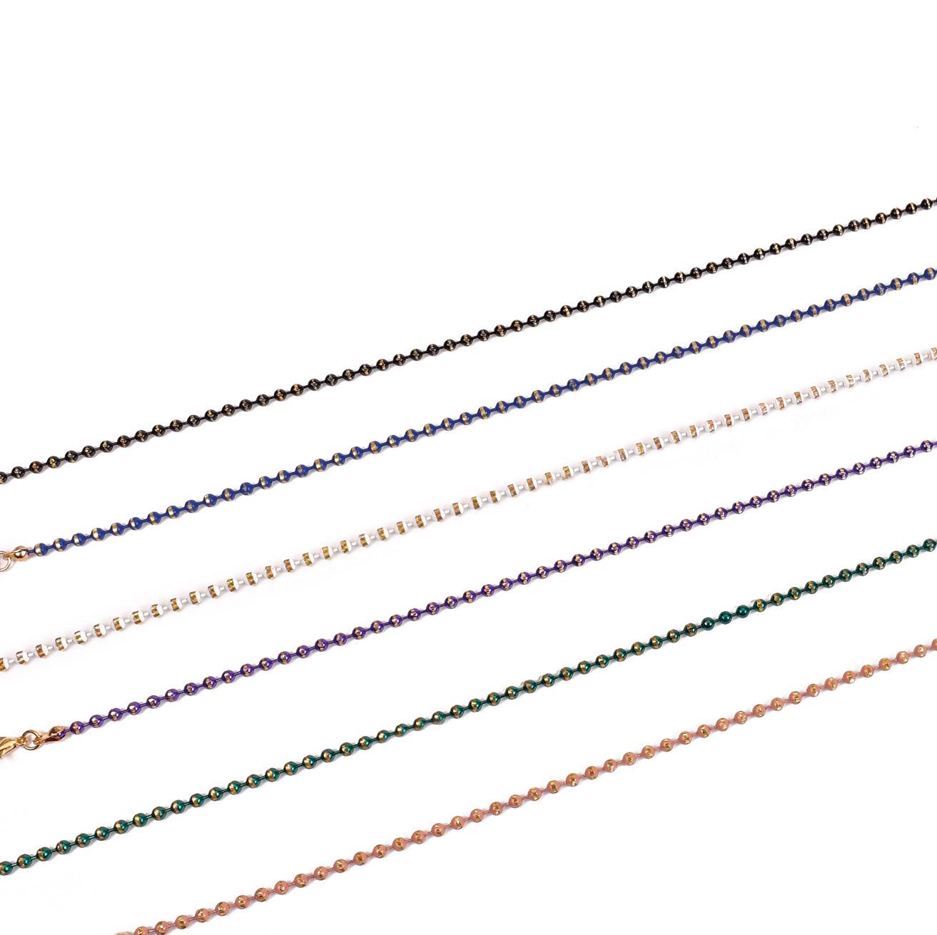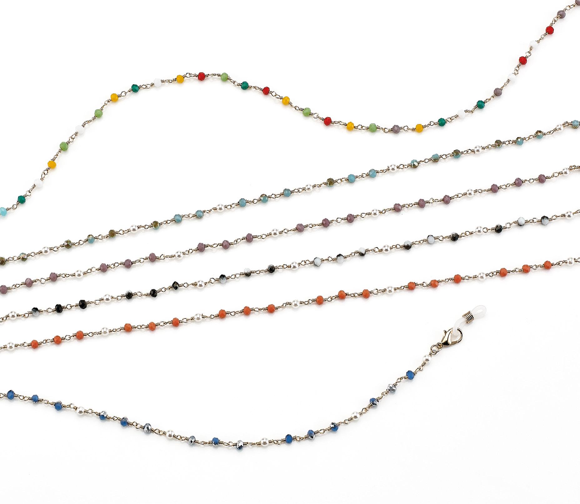 6 catenelle con perle decorative di vari colori, in vassoio espositivo. Complete di pochette in microfibra. Ref. 74055N