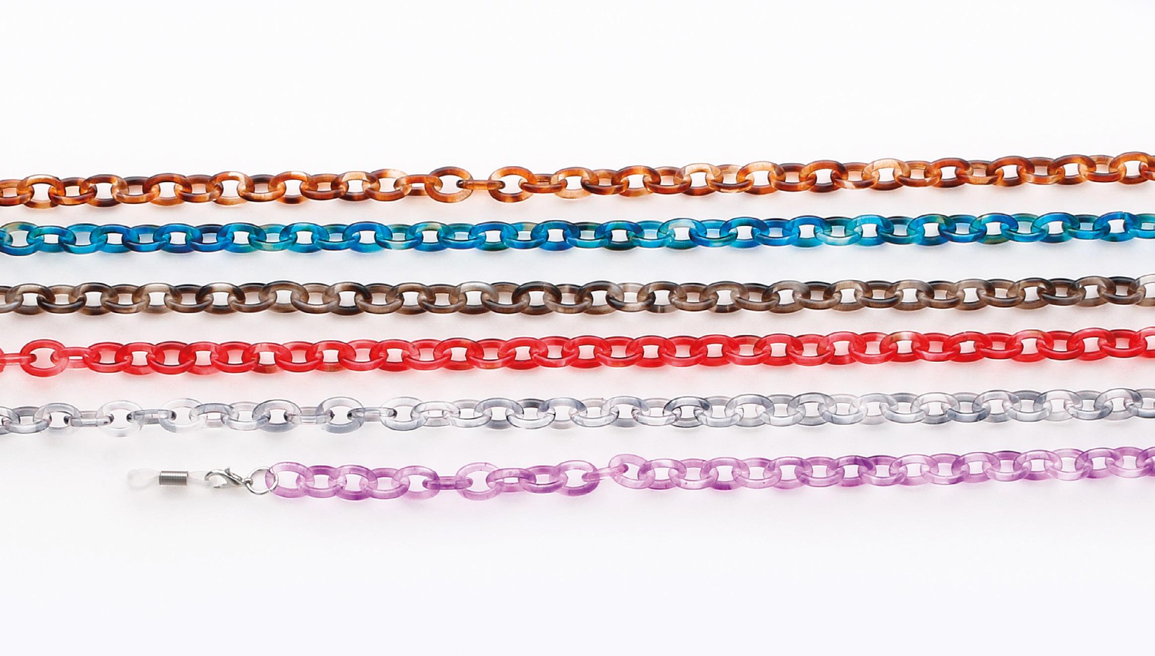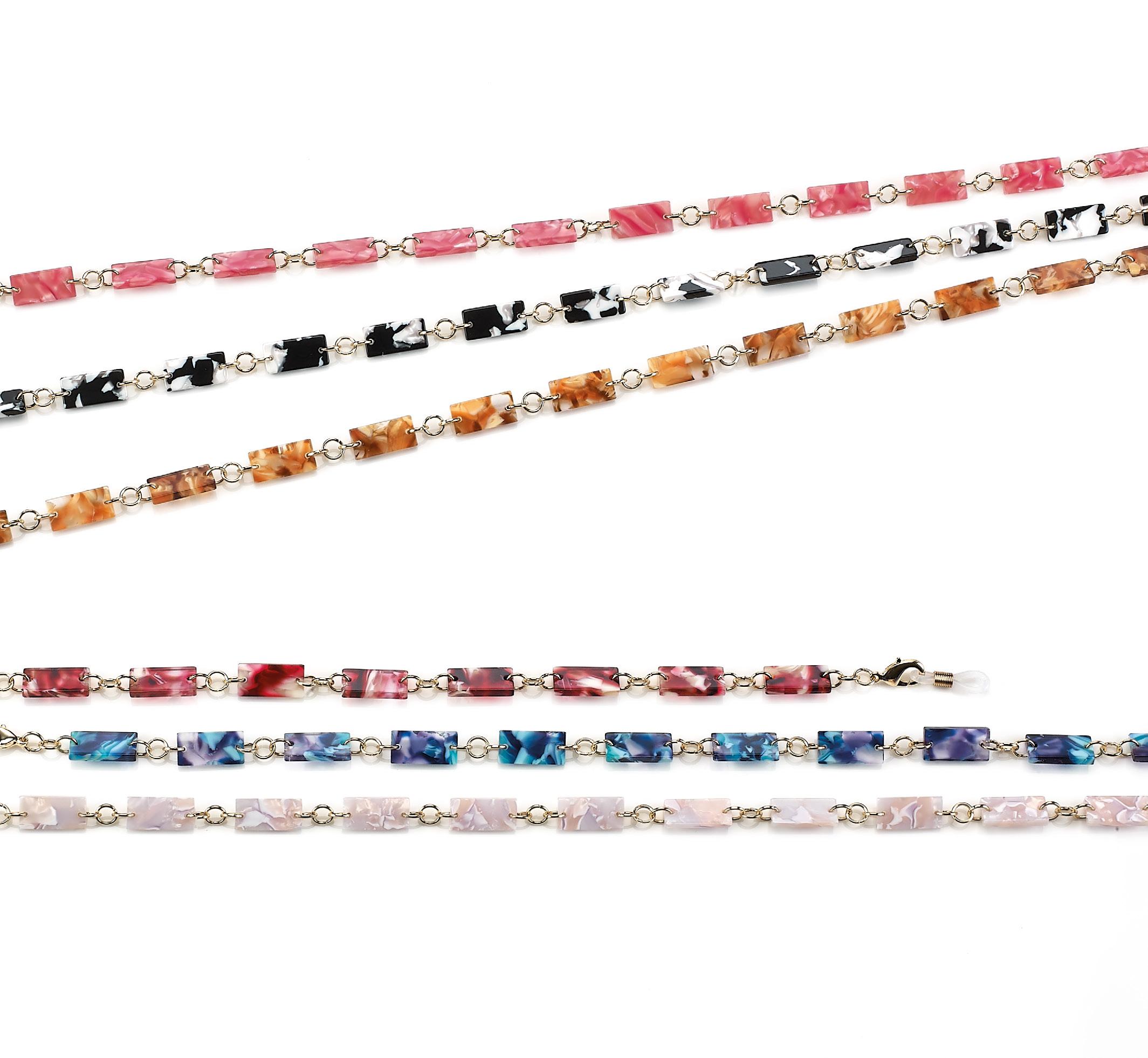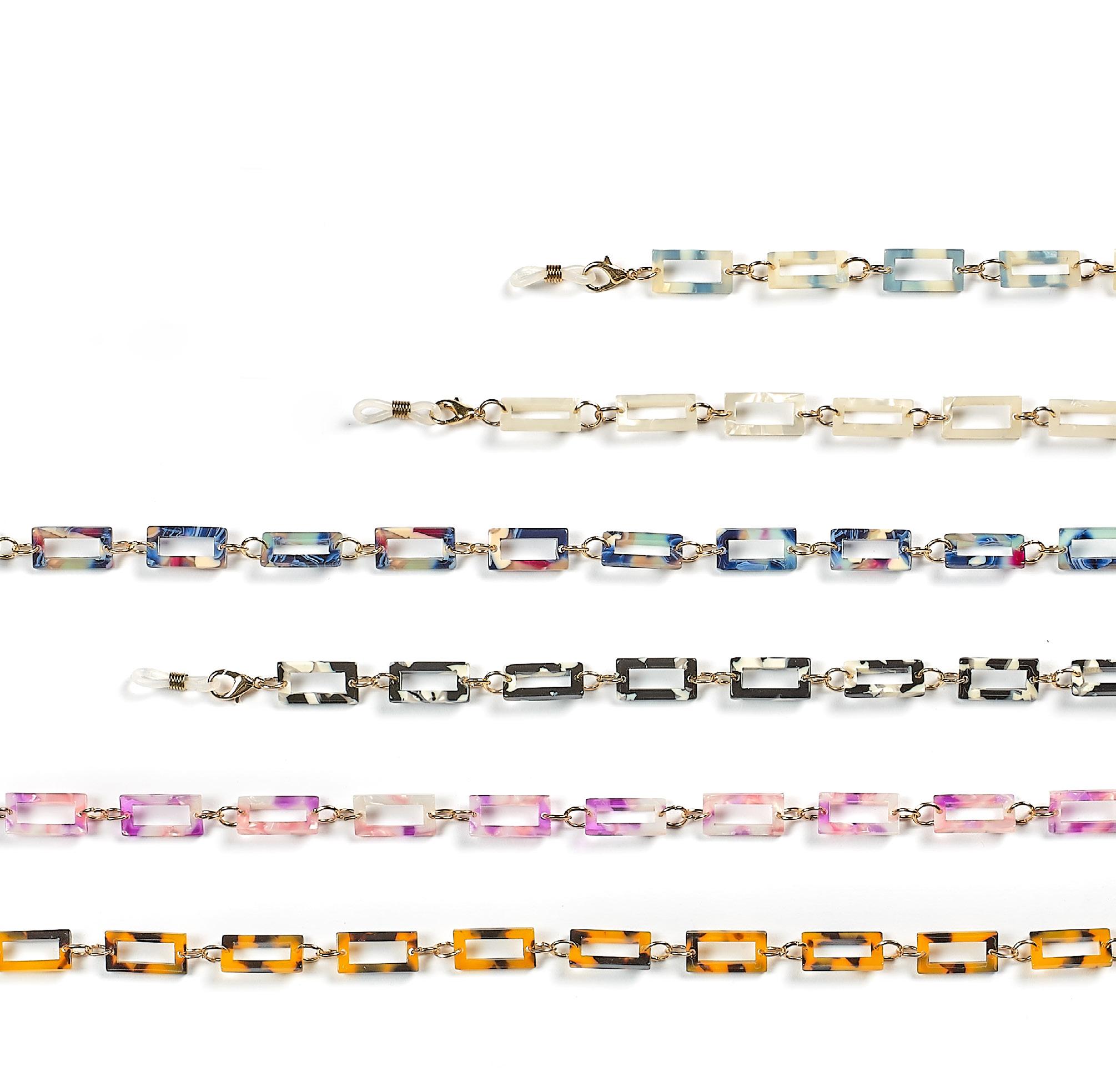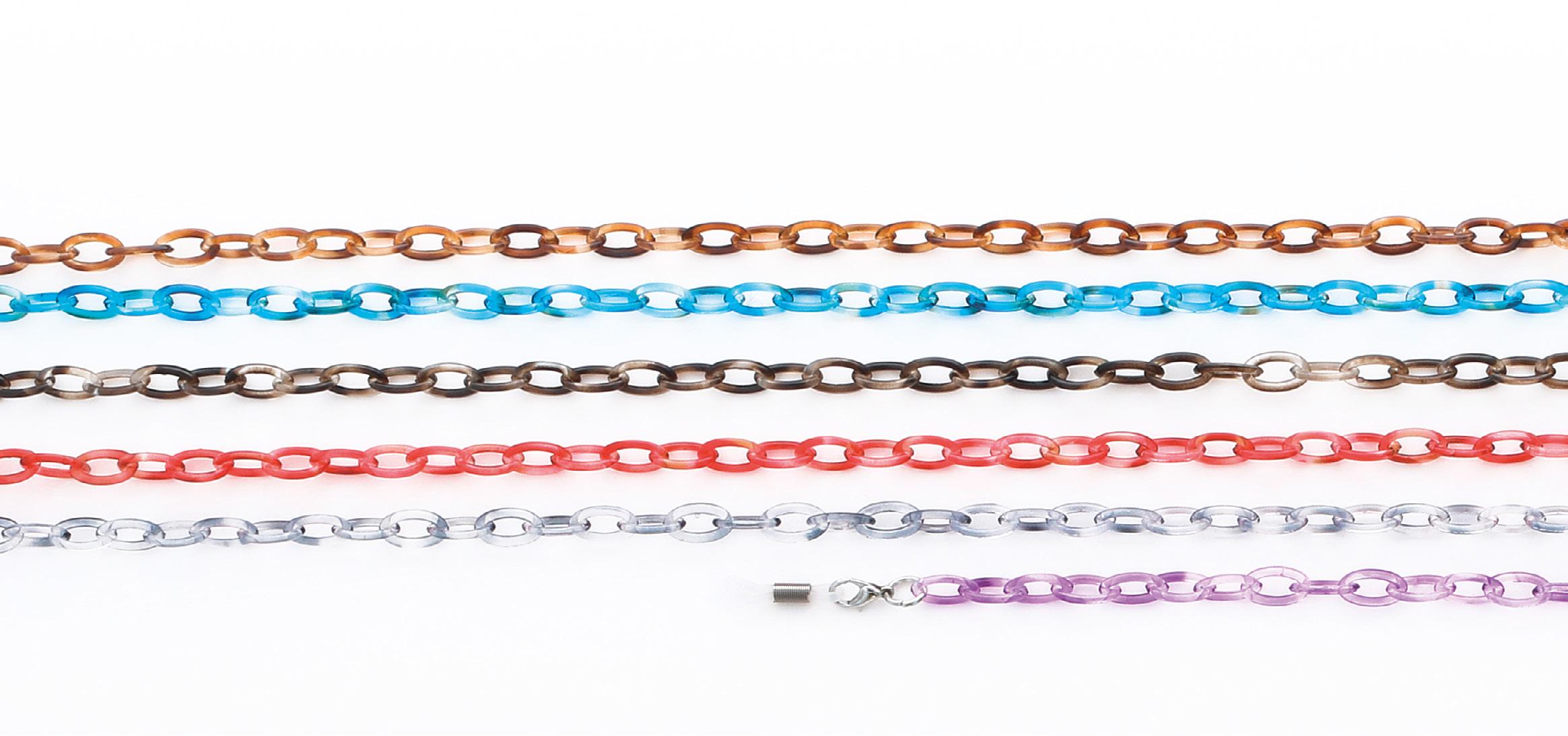 6 catenelle di tendenza, realizzate in acetato, ultraleggere, ideali per occhiali da sole e da vista. Complete di pochette in microfibra.