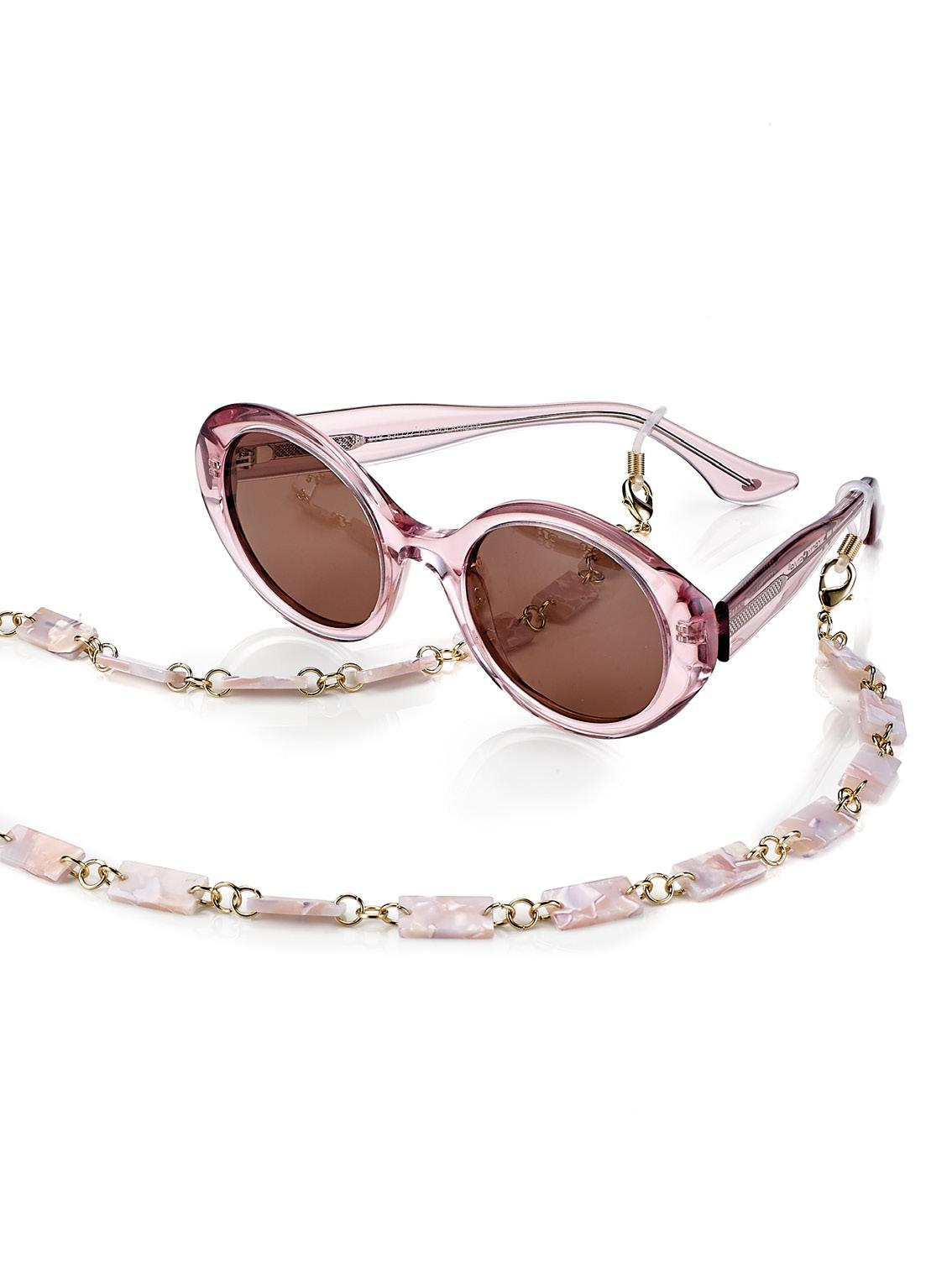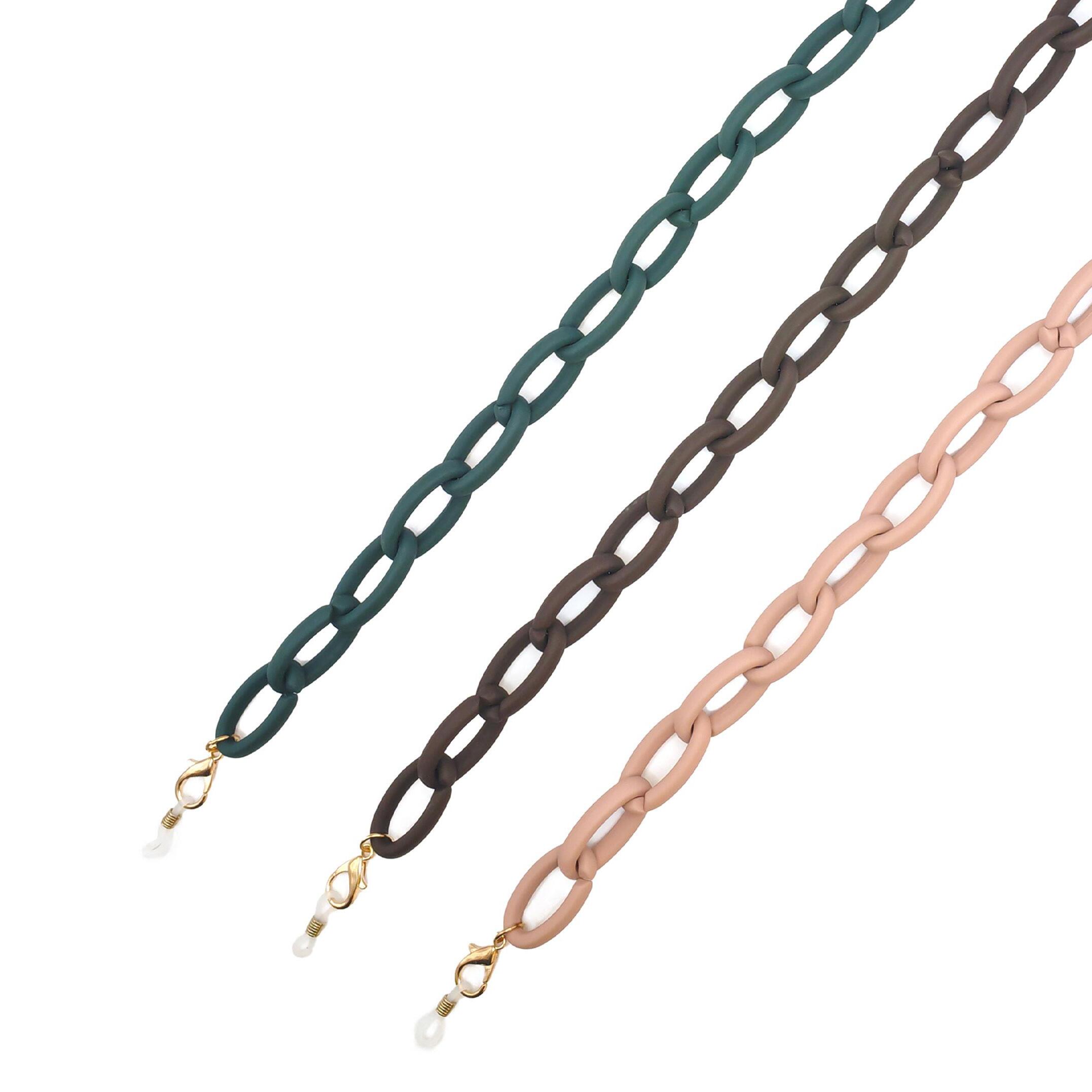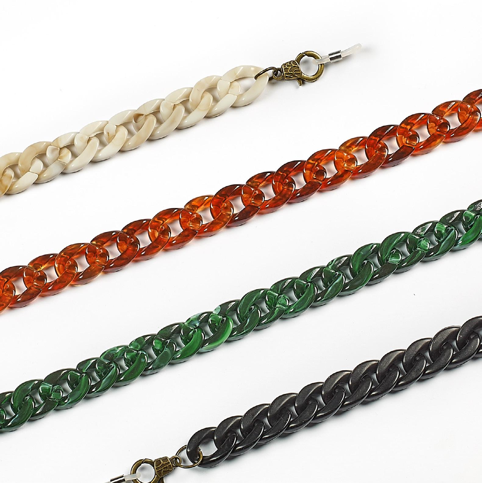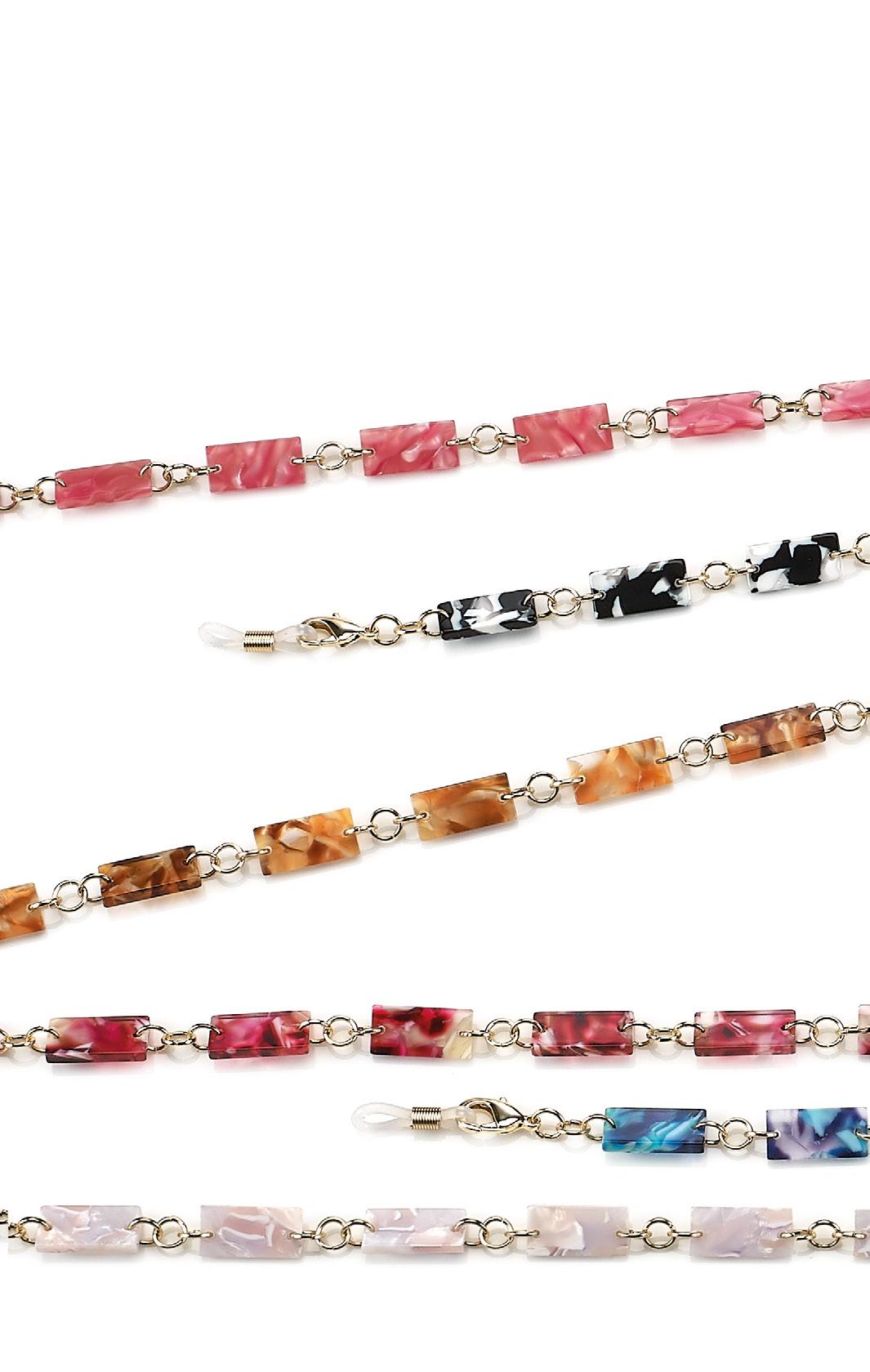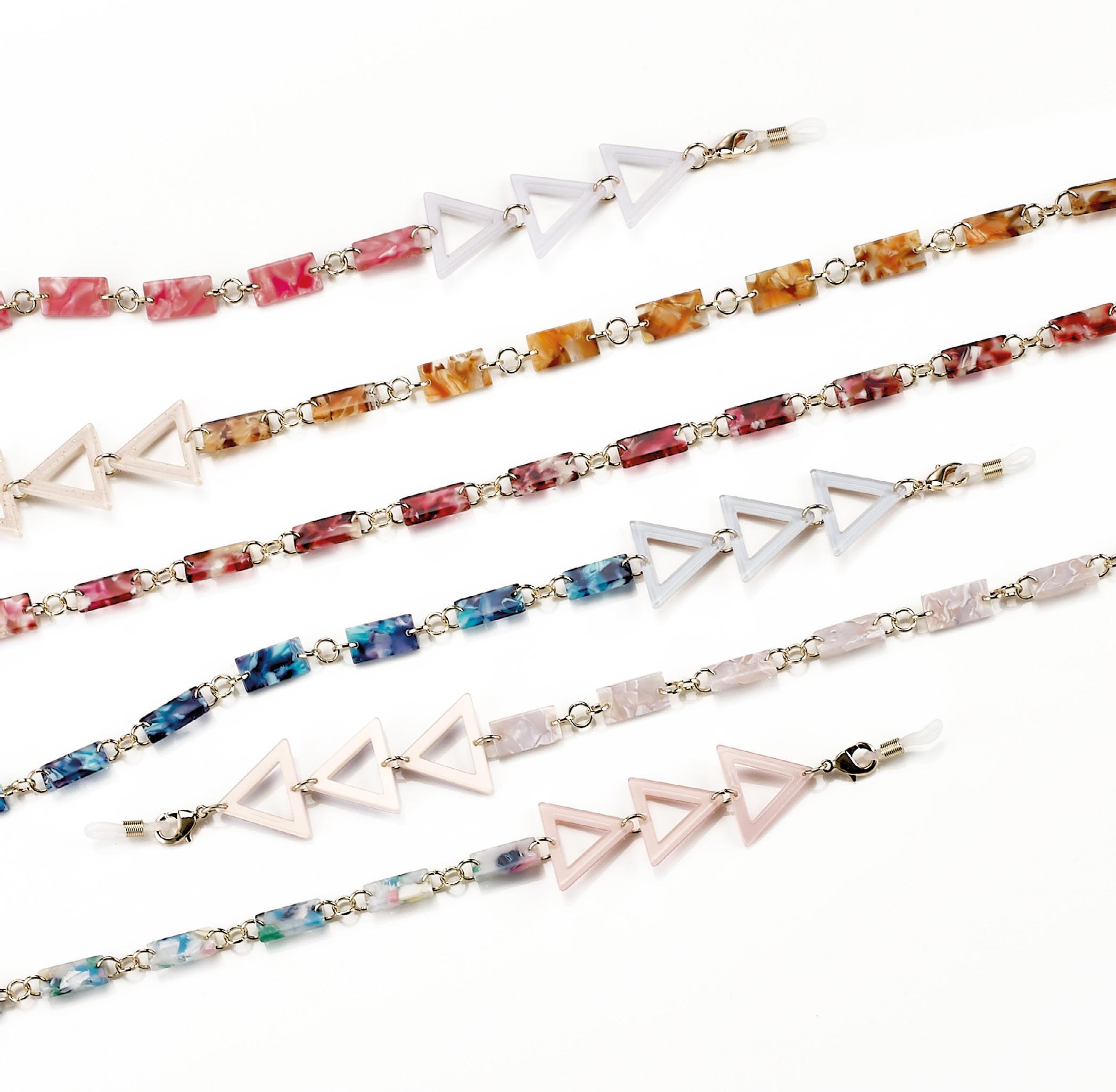6 catenelle di tendenza, realizzate in acetato, ultraleggere, ideali per occhiali da sole e da vista. Complete di pochette in microfibra.