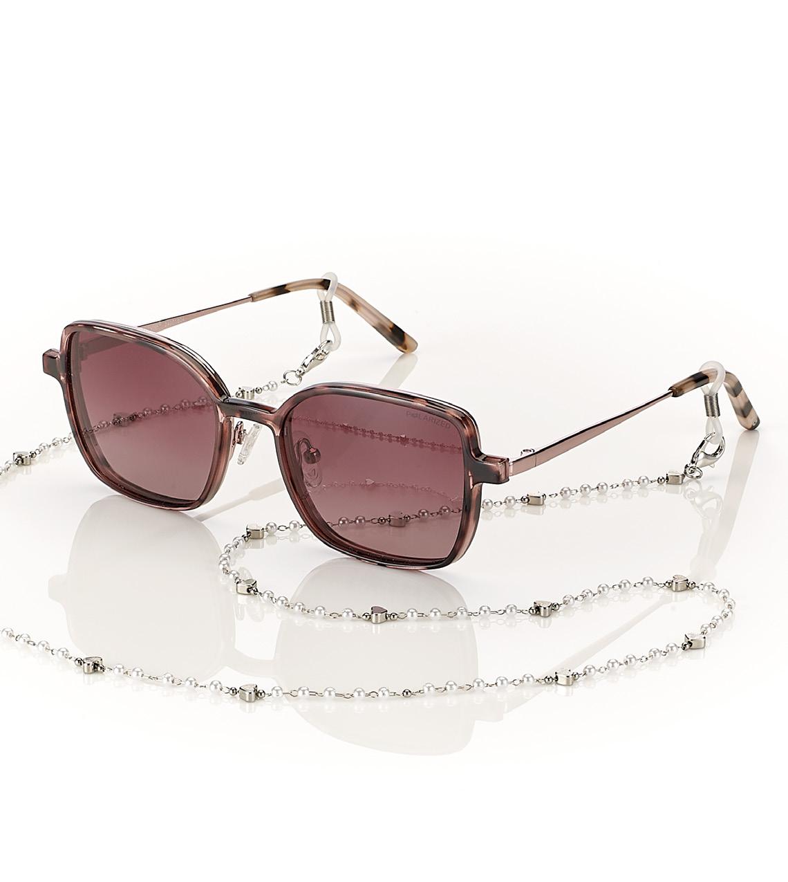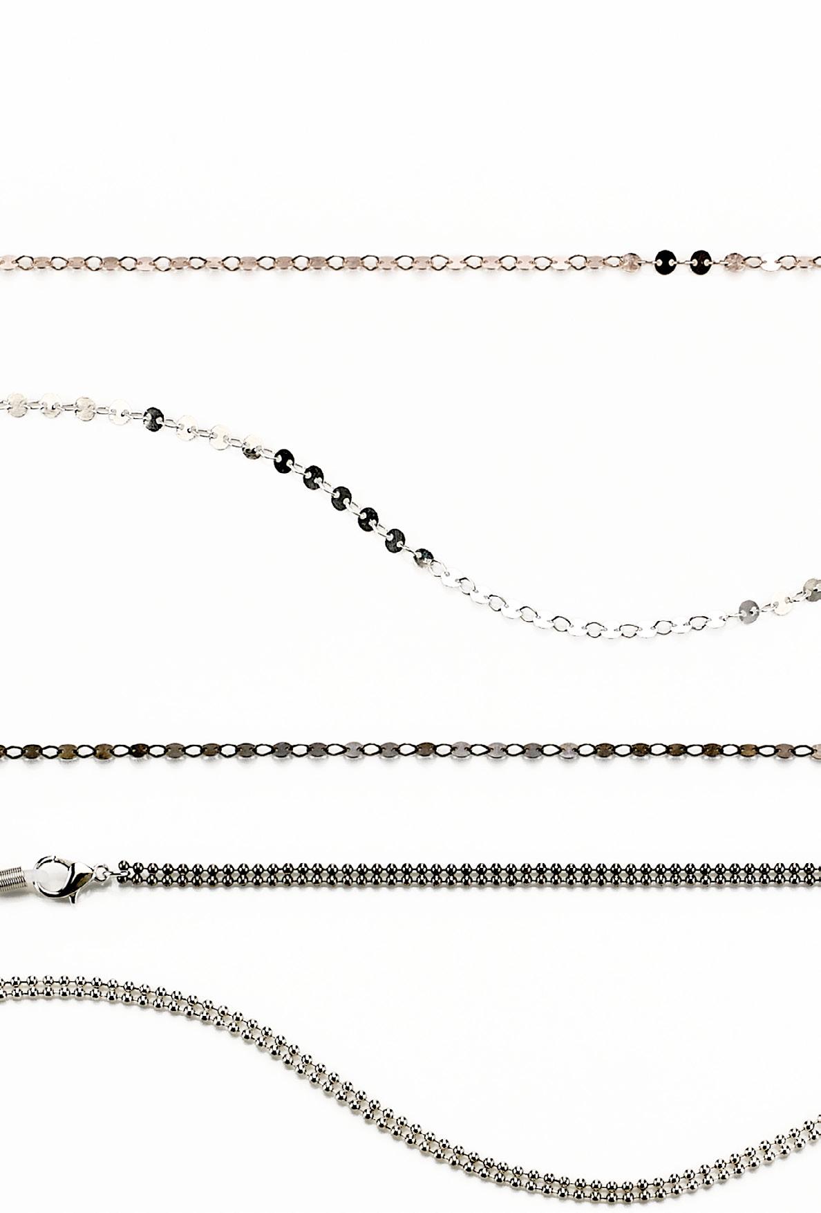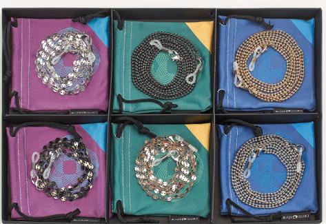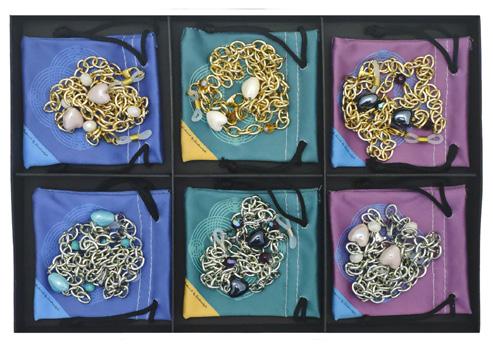 6 catenelle in metallo, 2 modelli in tre varianti colore. Modello femminile con effetto shiny e modello unisex ideali per occhiali da sole e da vista. In vassoio espositivo e complete di pochette in microfibra. Ref. 74138