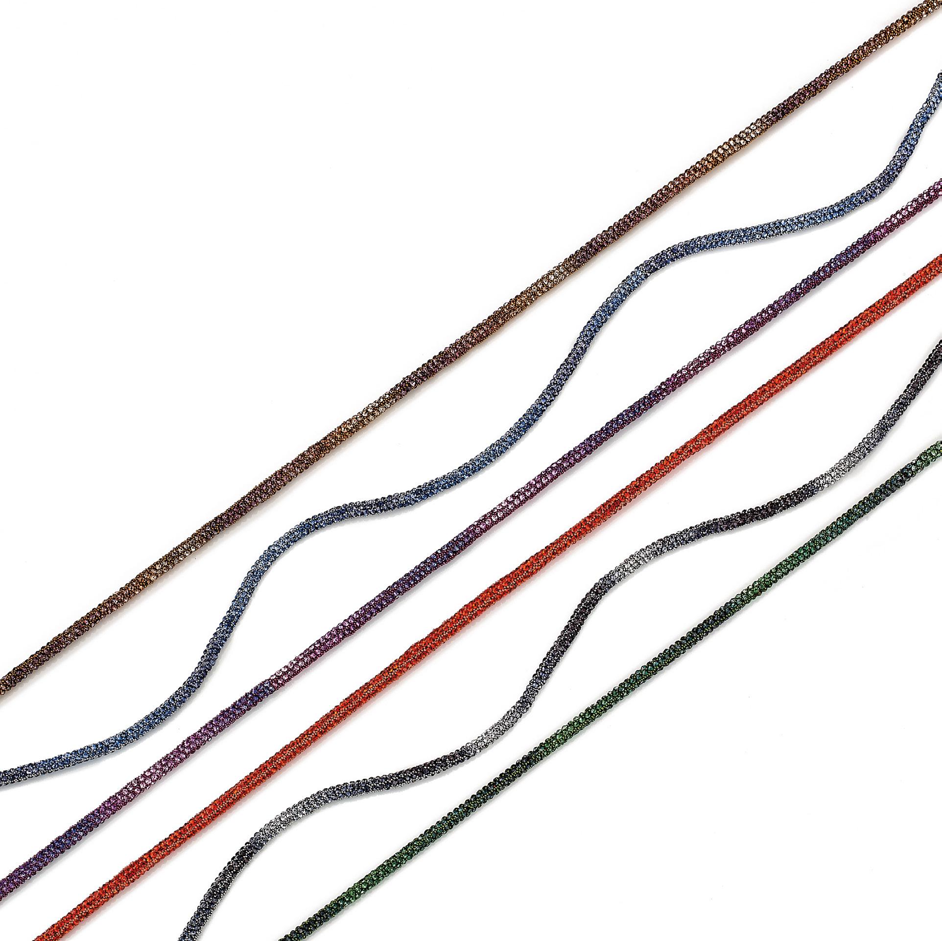 6 catenelle tubicini nate da un intreccio di strass e perline in metallo, in vassoio espositivo. Complete di pochette in microfibra Ref. 74125N
