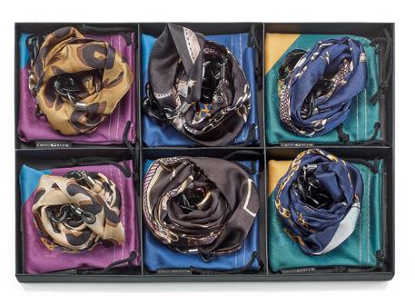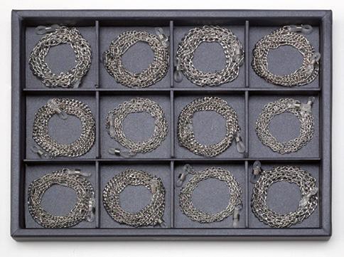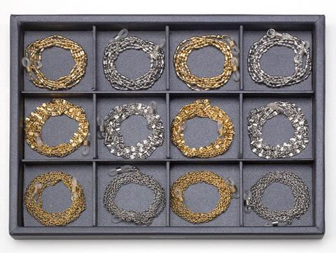 12 catenelle in metallo, 4 diverse maglie in 3 diverse colorazioni,complete di astucci in microfibra, in due vassoi da 6 pezzi.