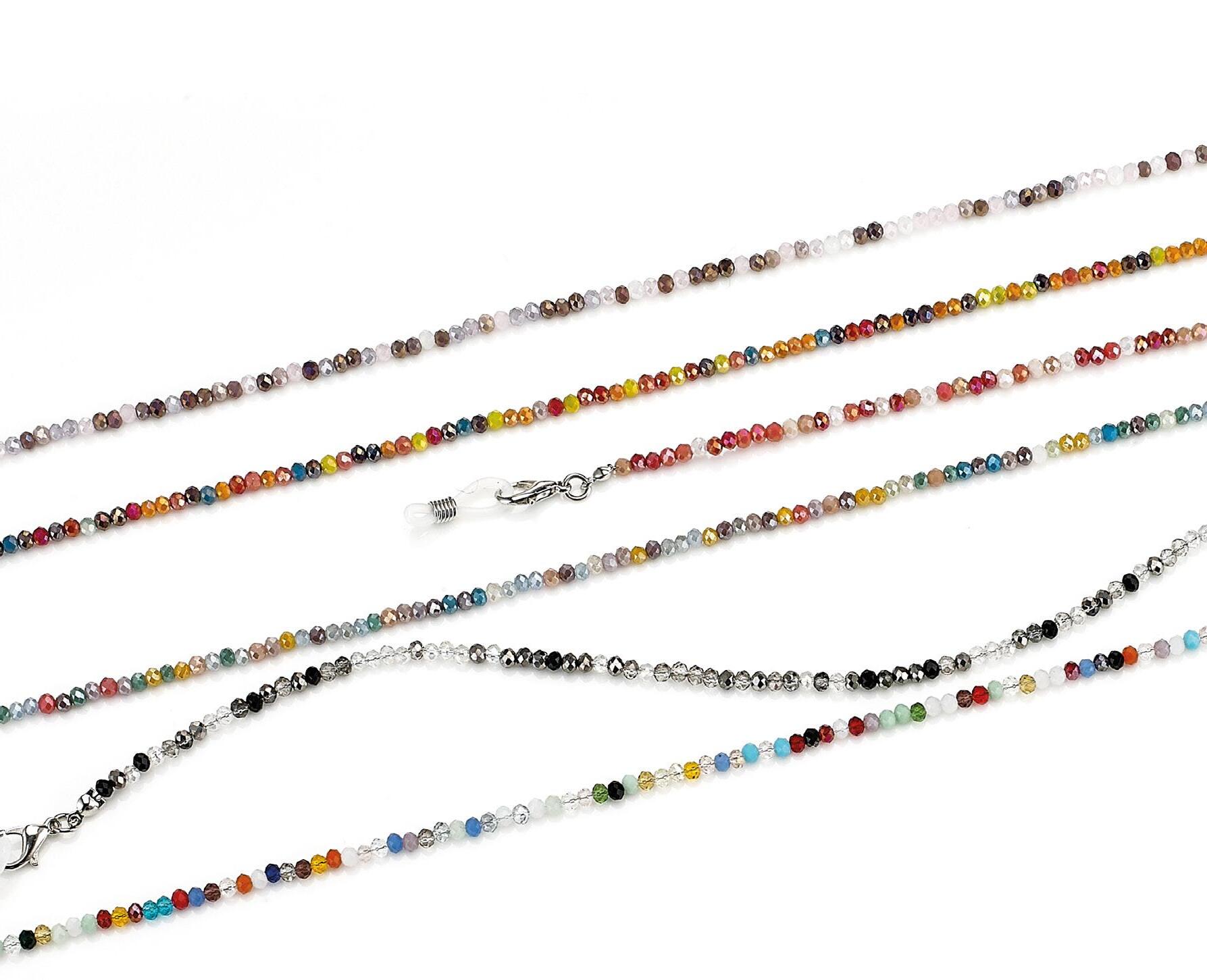 6 catenelle in metallo con perle decorative di vari colori, in vassoio espositivo.Complete di pochette in microfibra.