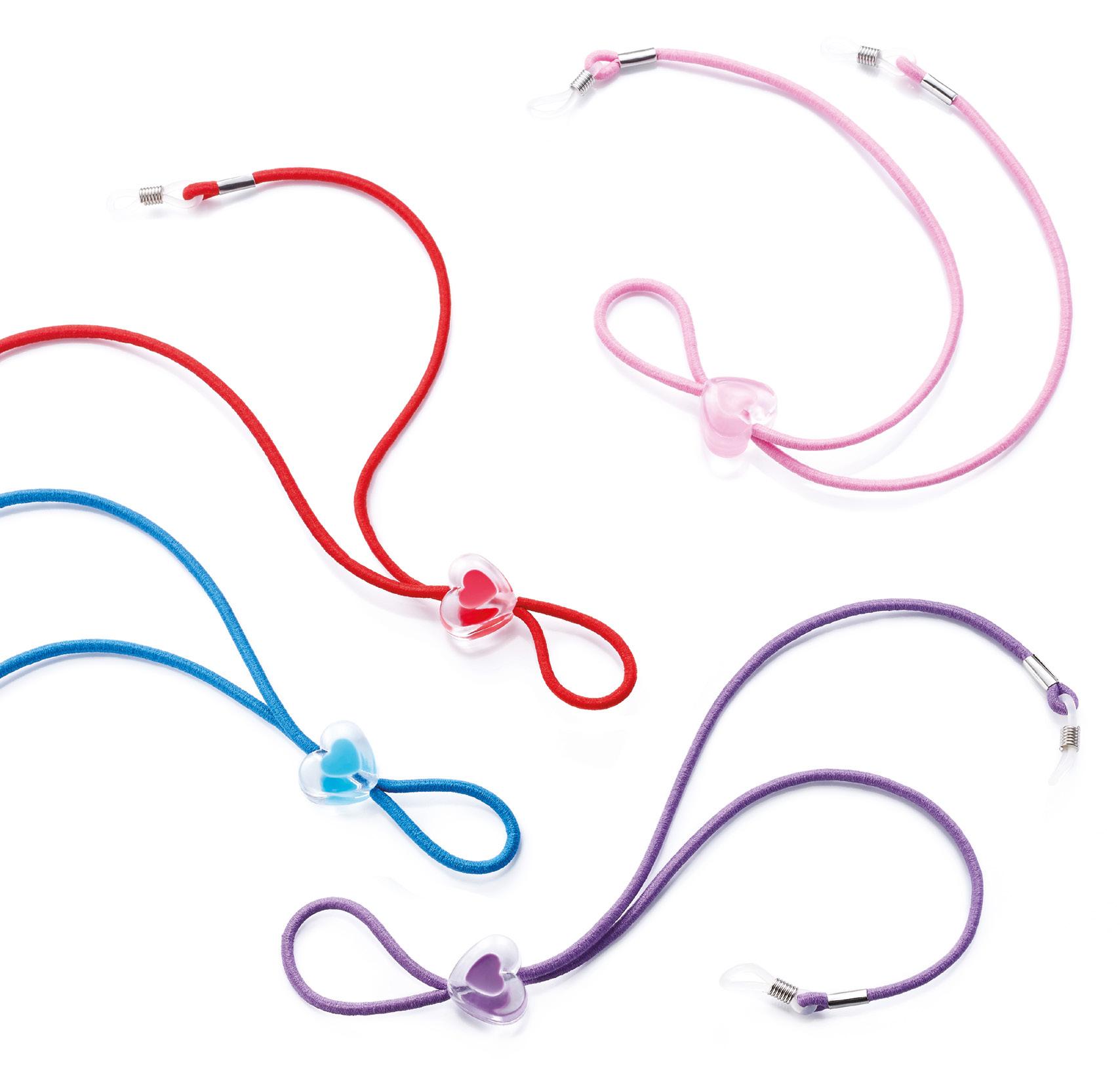 Cordoncini per occhiali da bambini con cursore per la regolazione a forma di cuore, con finiture in metallo nickel free.