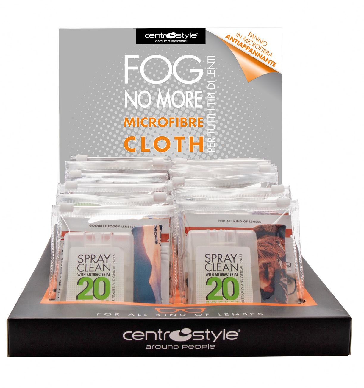 • Kit composto da Spray Clean 20 con antibatterico, microfibra 15x18 cm e panno antiappannante 13x15 cm in astuccio trasparente.