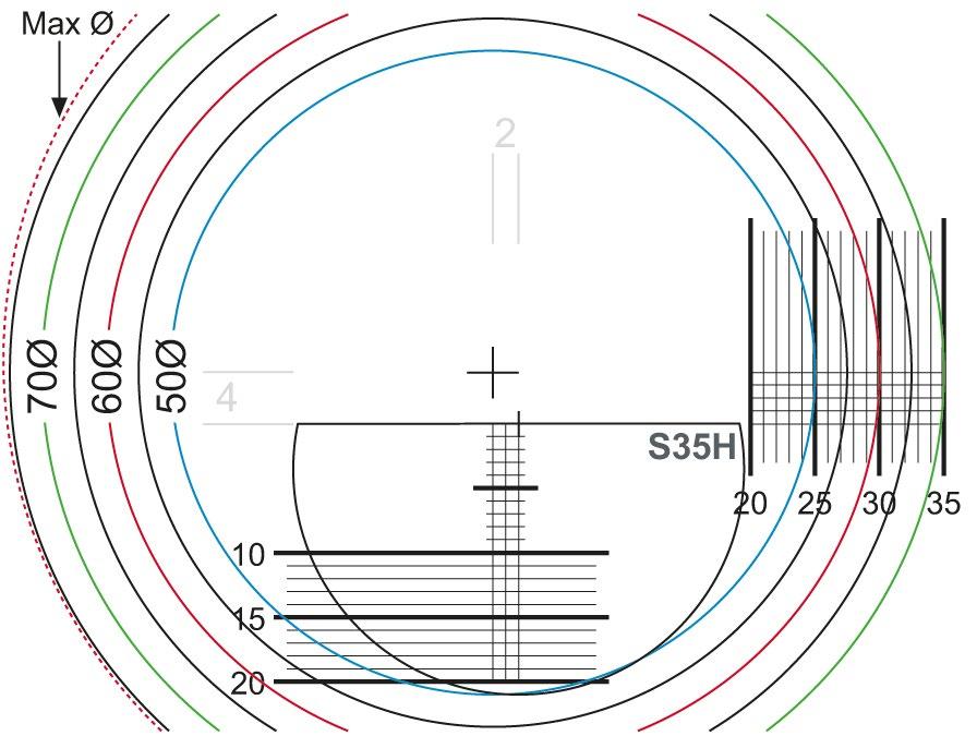 A volte, in presenza di una piccola zona Myosoft o Hypersoft, è necessario diminuire questa distanza. Il punto di riferimento del prisma sarà sempre centrato tra questi segni. In questi casi, la distanza tra le incisioni è di 26 mm.
