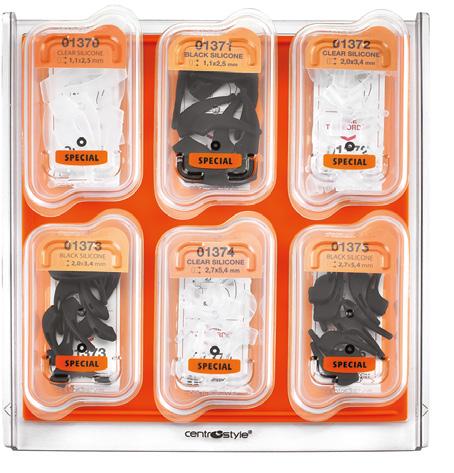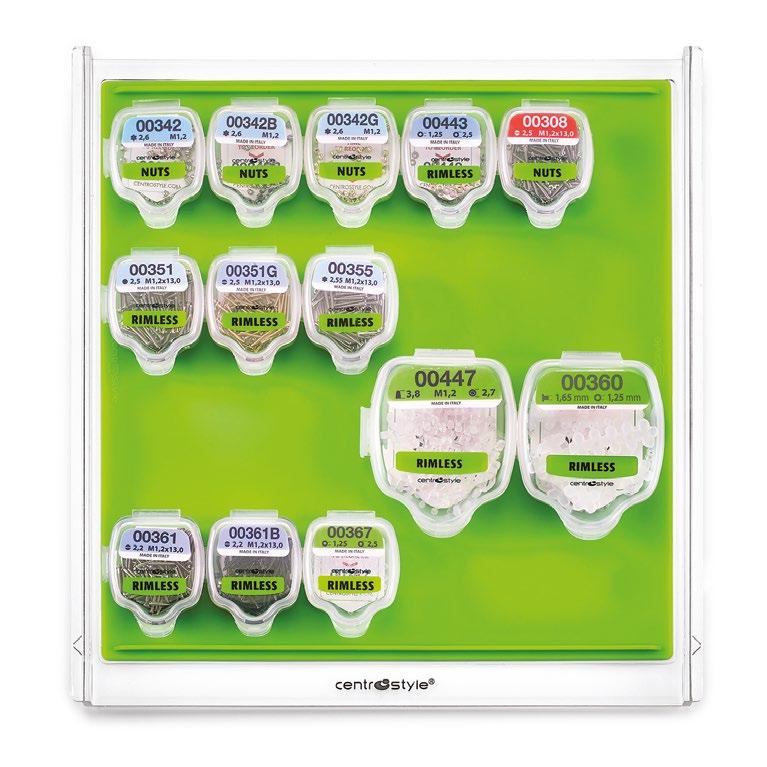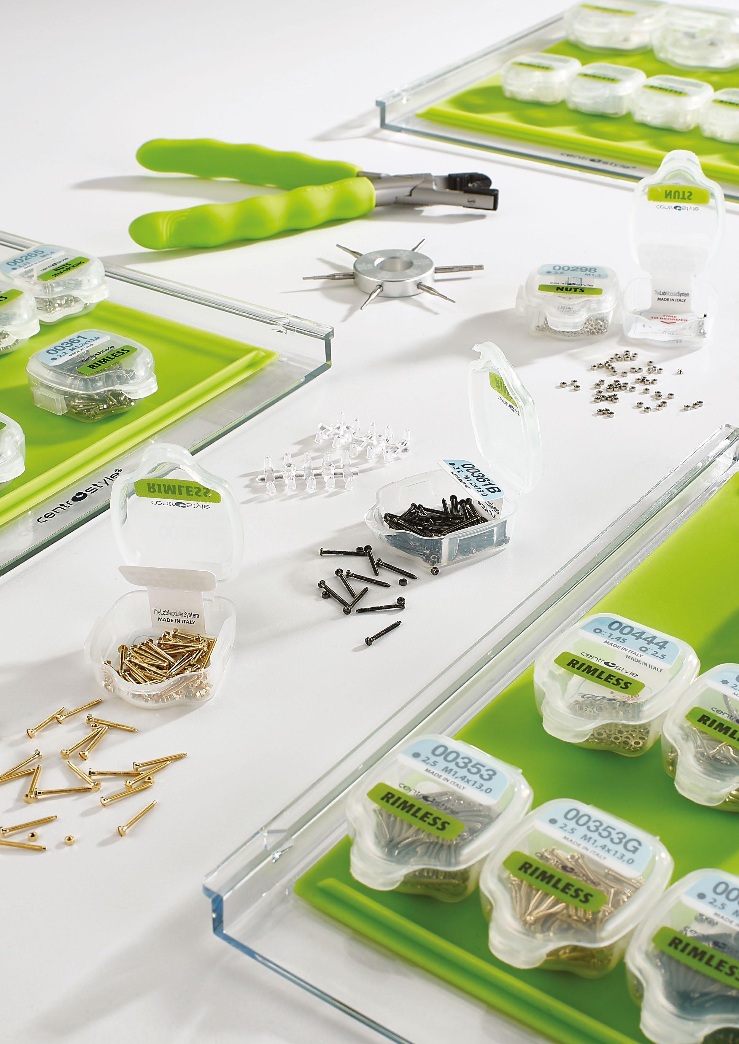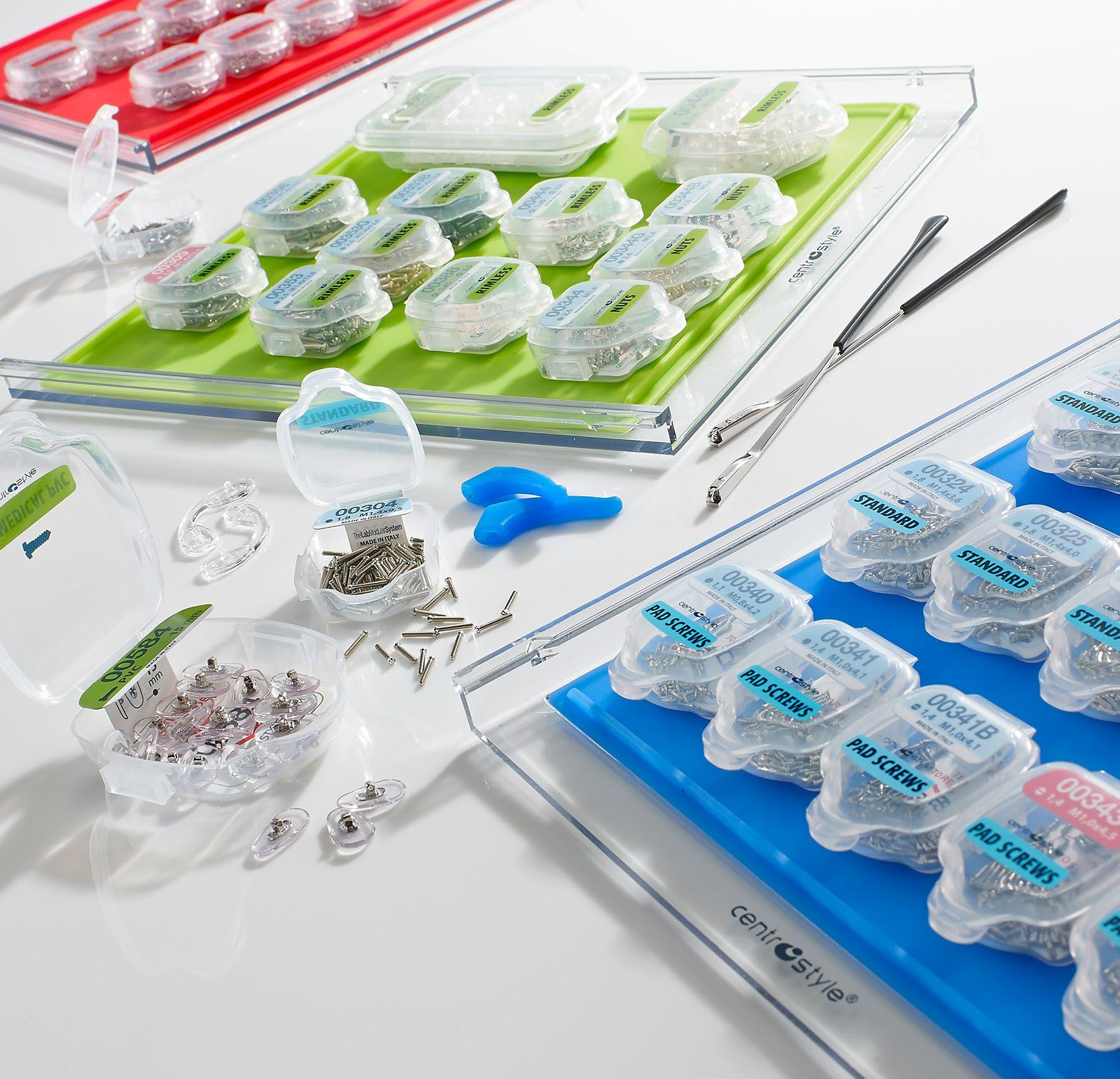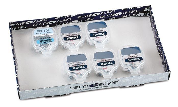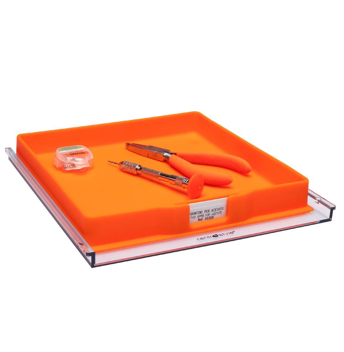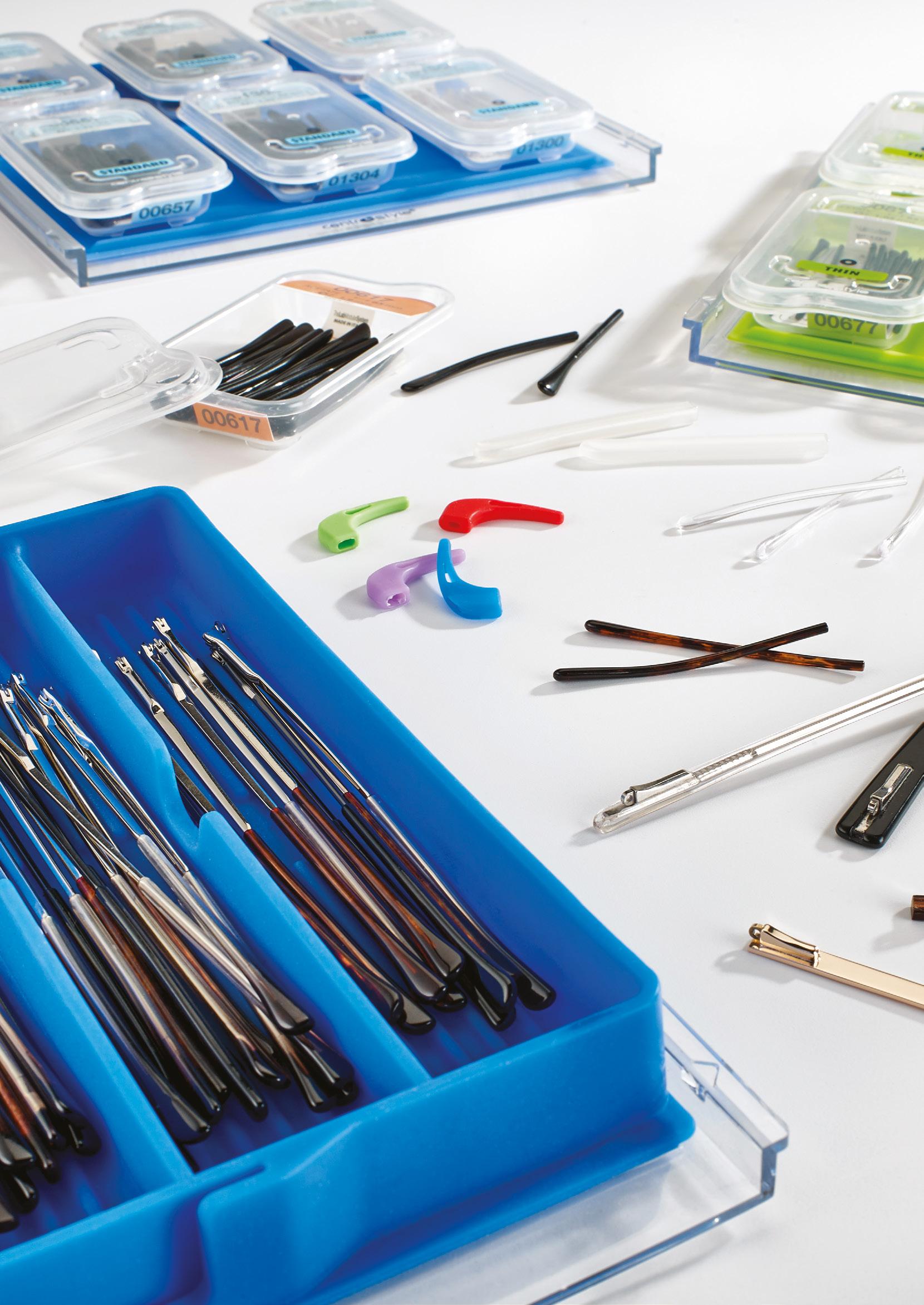 Una selezione di utensili e parti di ricambio indispensabili per rispondere alle necessità immediate di qualsiasi negozio di ottica. Comprende 1 cubo, 4 vassoi con un assortimento di parti staccate, un set di 8 pinze con porta pinze, 1 set completo di cacciaviti e 1 di giradadi, una confezione di pennarelli per marcare le lenti e una serie di utili prodotti in silicone.