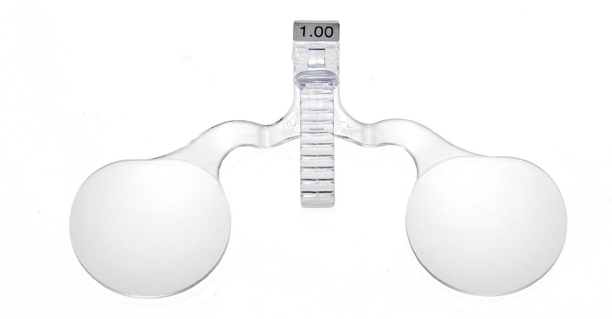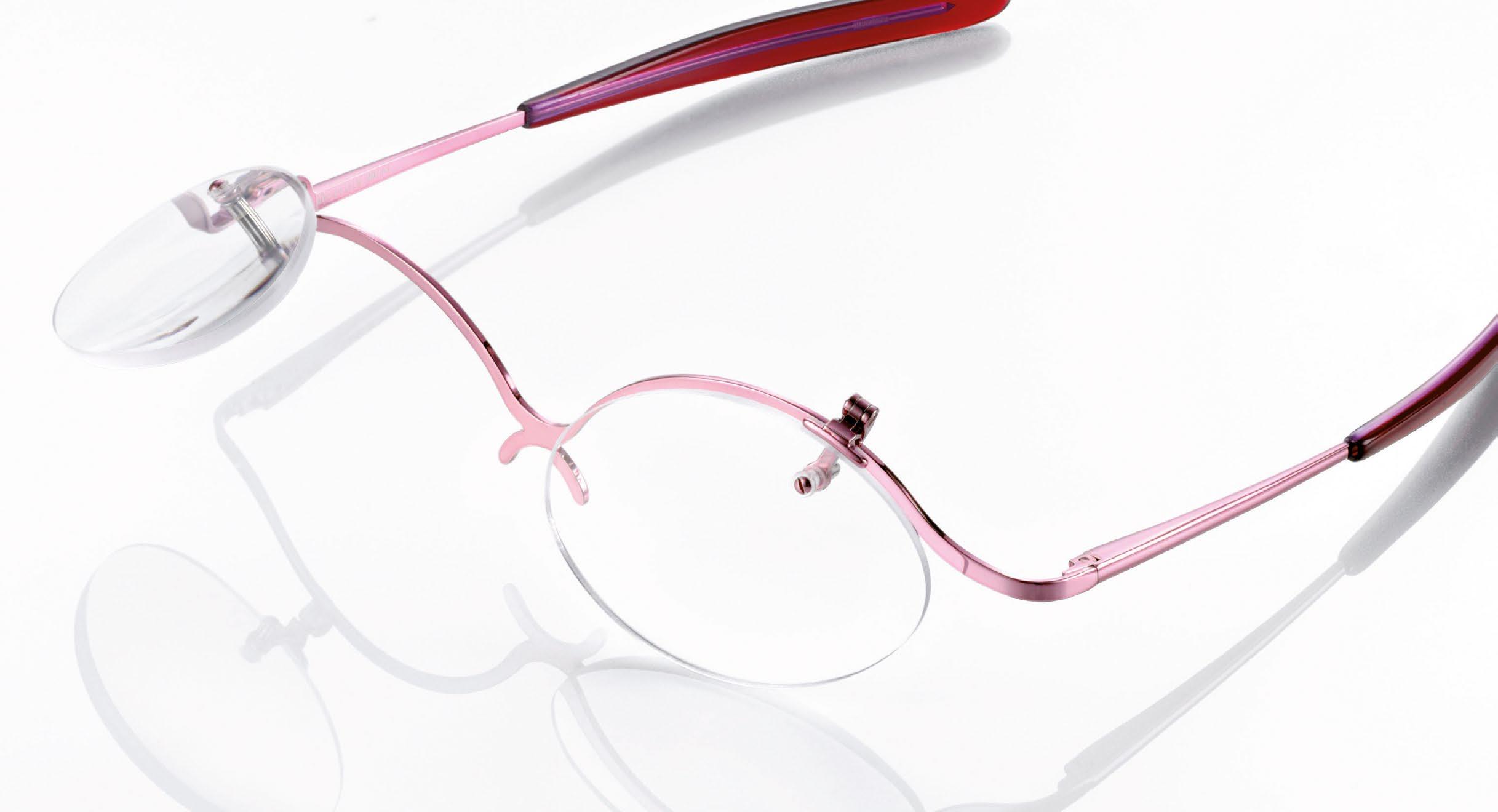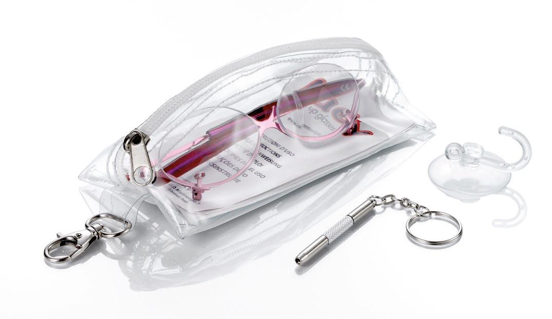 Lightweight metal make-up frame. The symmetrical shape, straight sides and ‘upside-down’ lenses allow a complete make-up with eyeliner, eyeshadow and mascara. Complete with case, pocket screwdriver and hanging hook with suction cup.