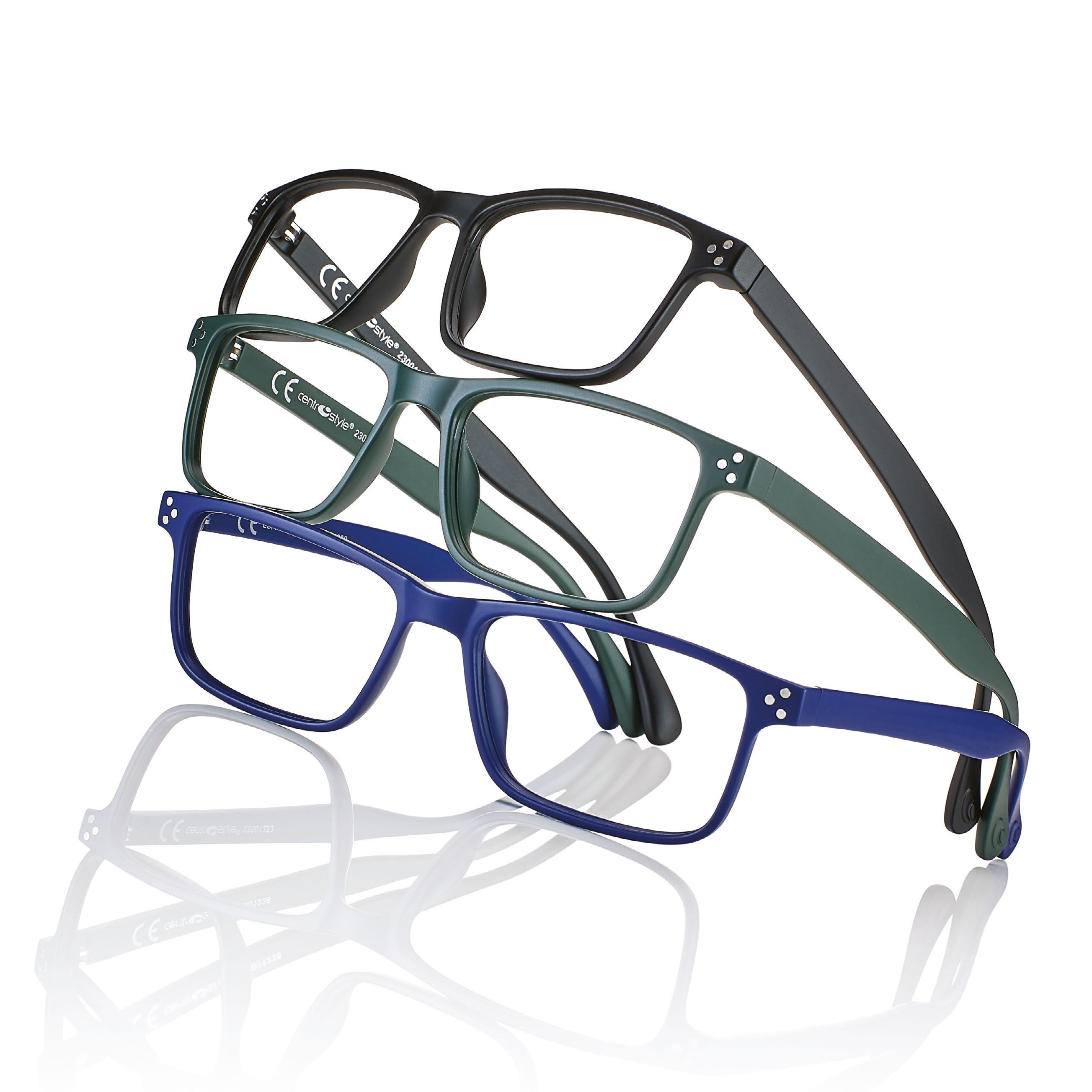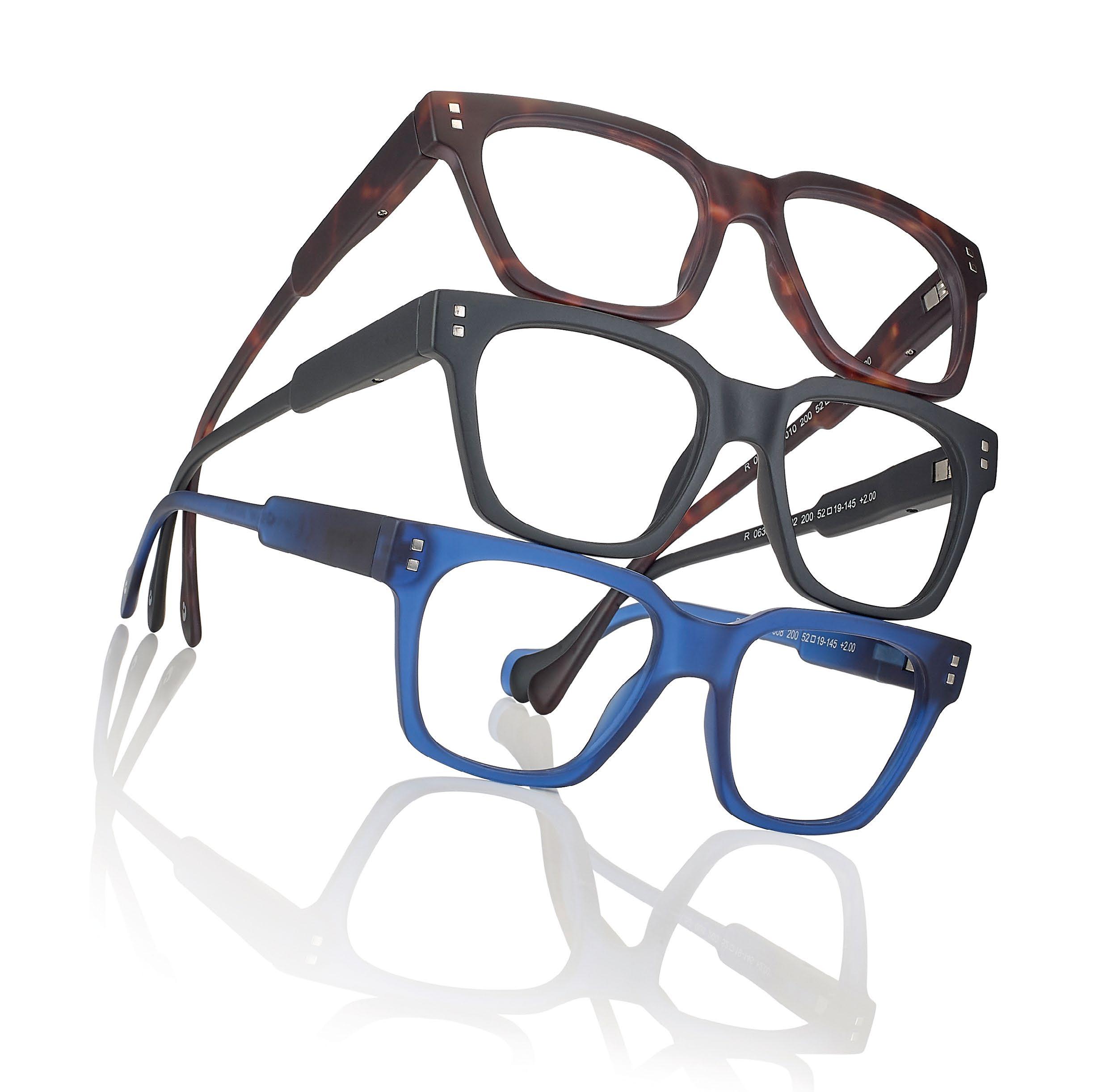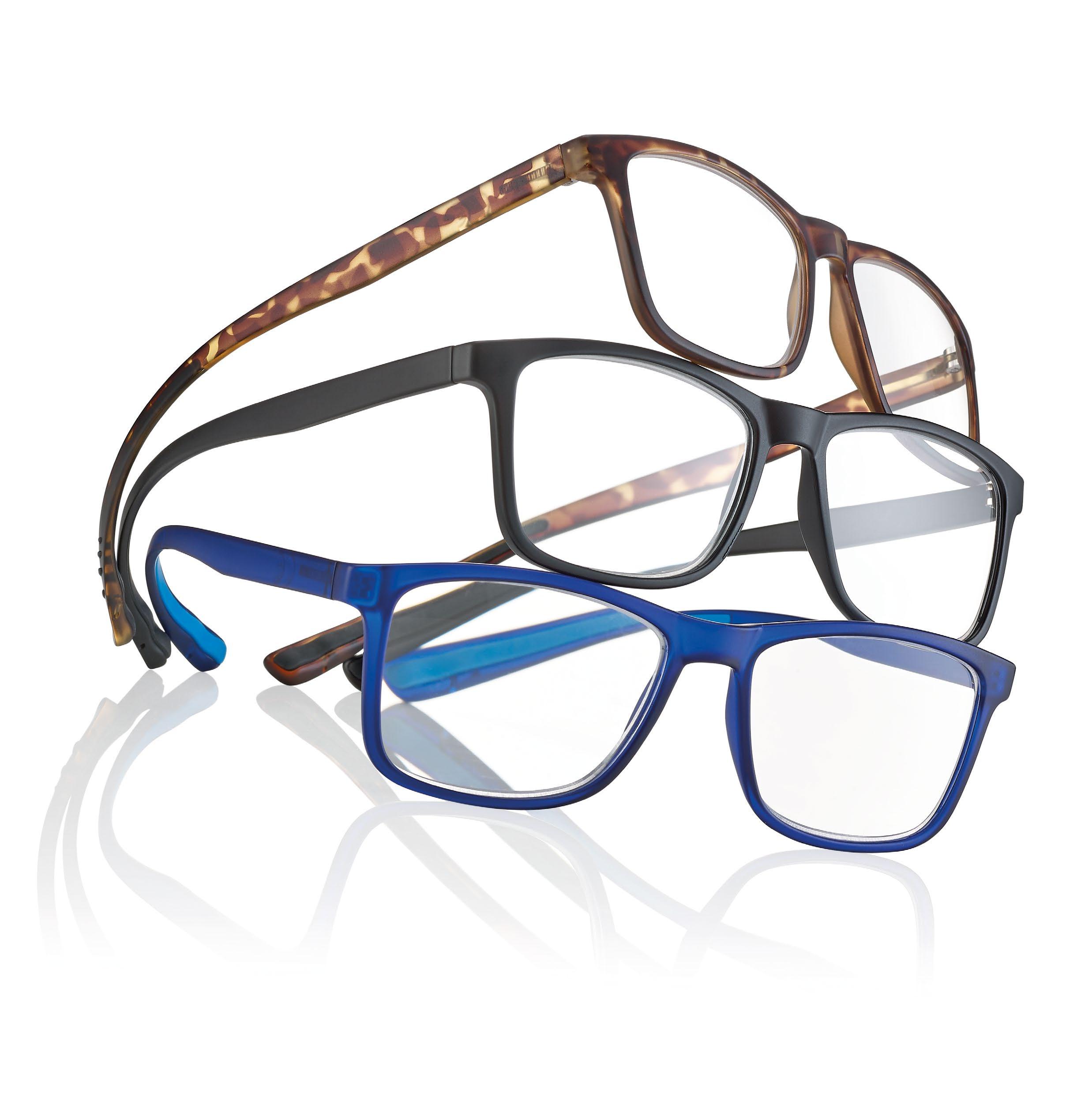 Reading glasses for men made of lightweight material (polycarbonate). Blue light filter lenses provide greater reading comfort when using digital devices. The Spotify playlist dedicated to the collection is available on the packaging.