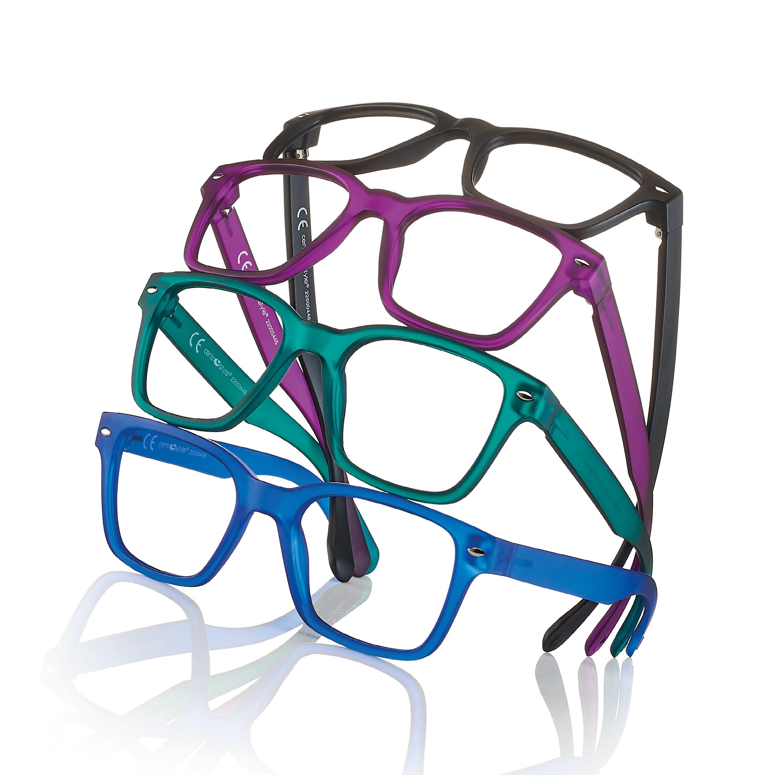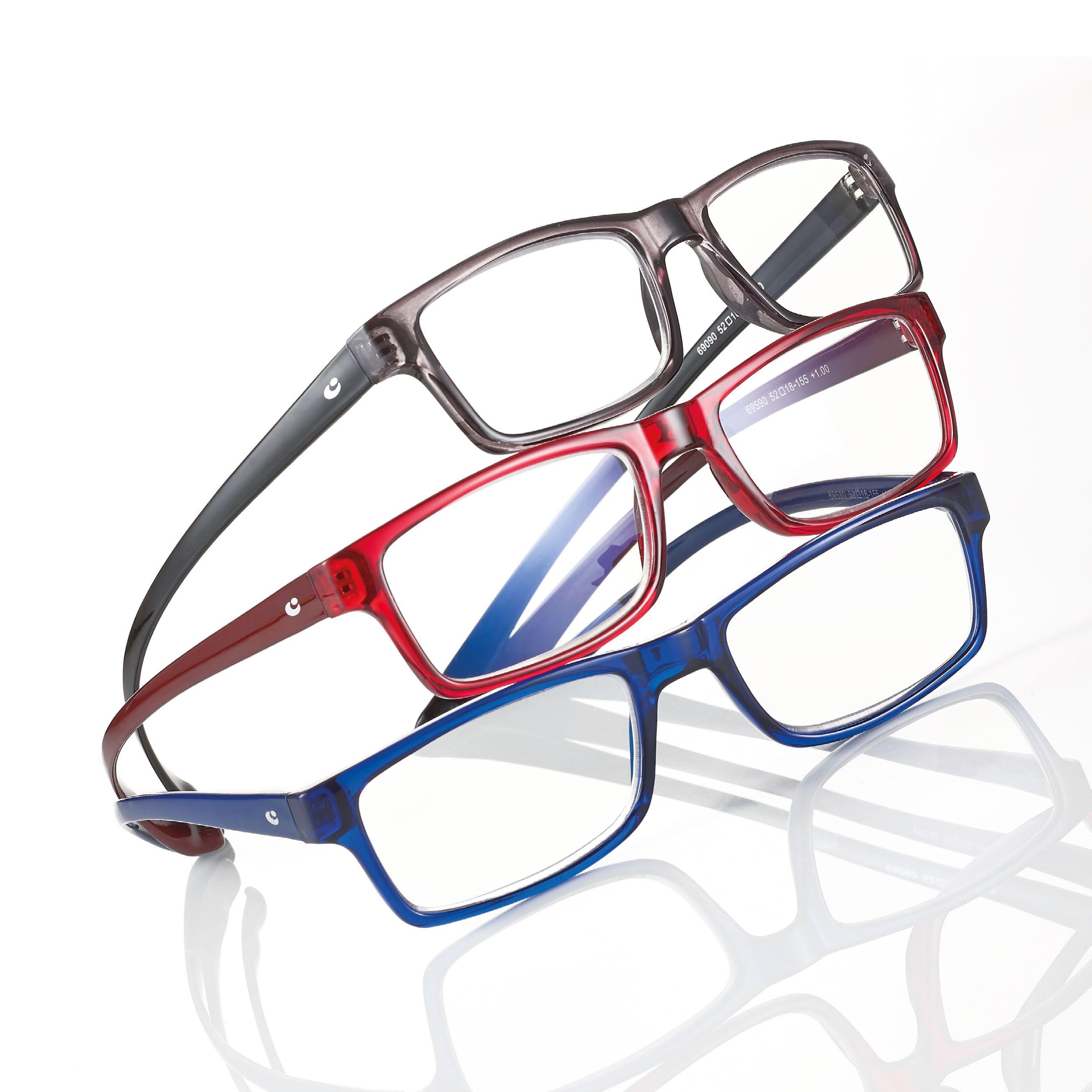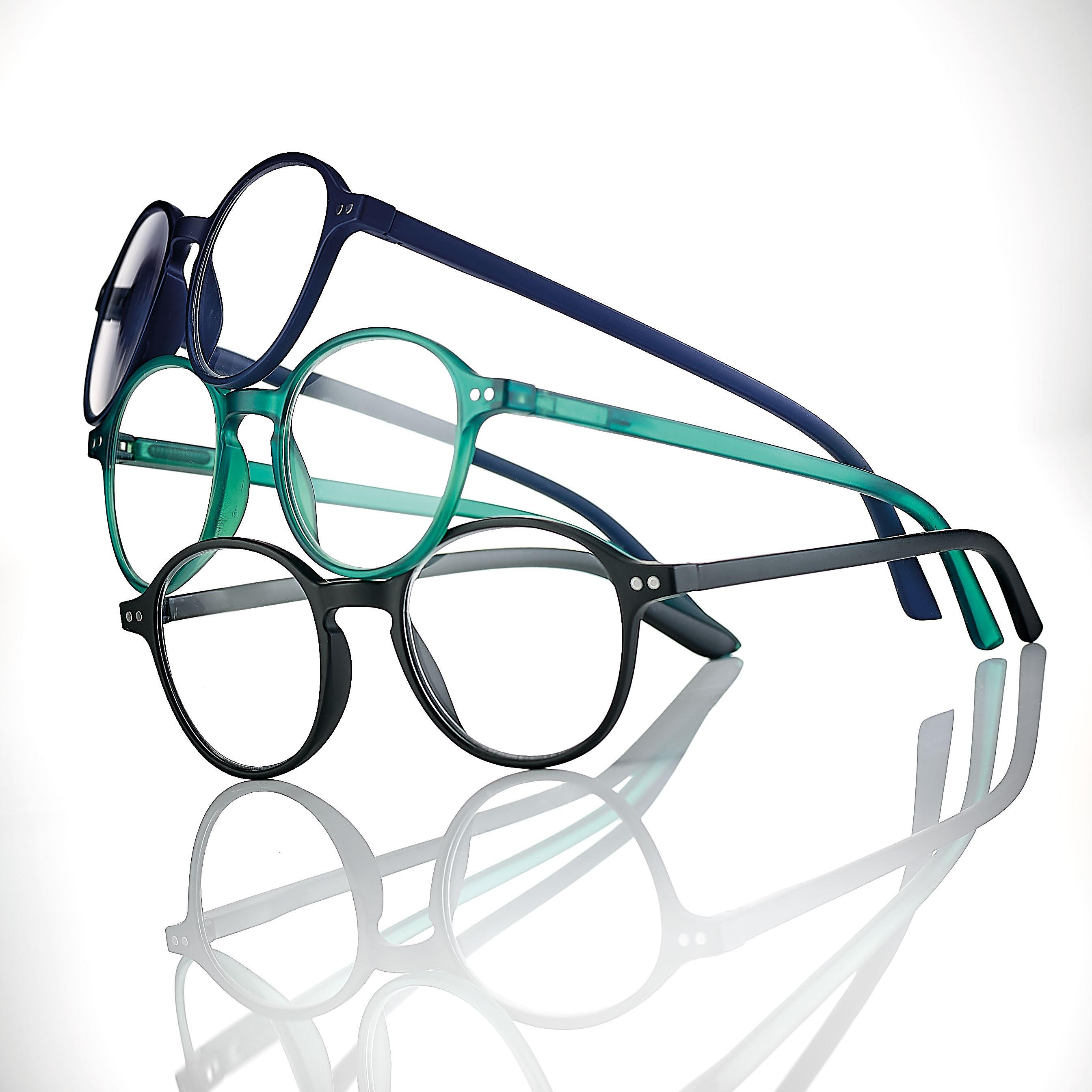 Reading glasses for men made of lightweight material (polycarbonate). Blue light filter lenses provide greater reading comfort when using digital devices. The Spotify playlist dedicated to the collection is available on the packaging.