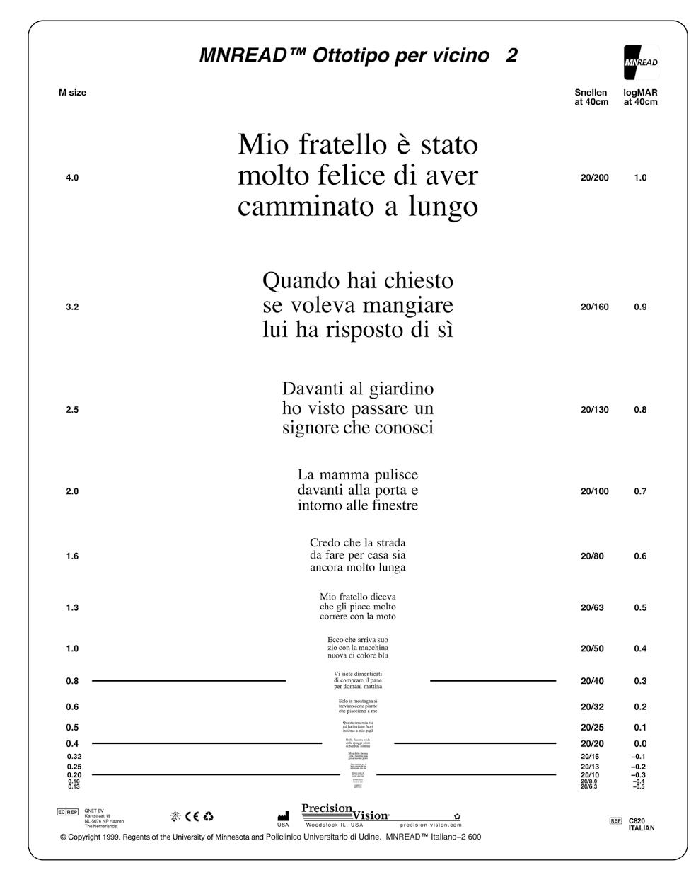 Il test MN READ è considerato il metodo più attendibile per la valutazione della capacità di lettura dei pazienti con Visione Sensibile e ipovisione, come anche per i normovedenti.