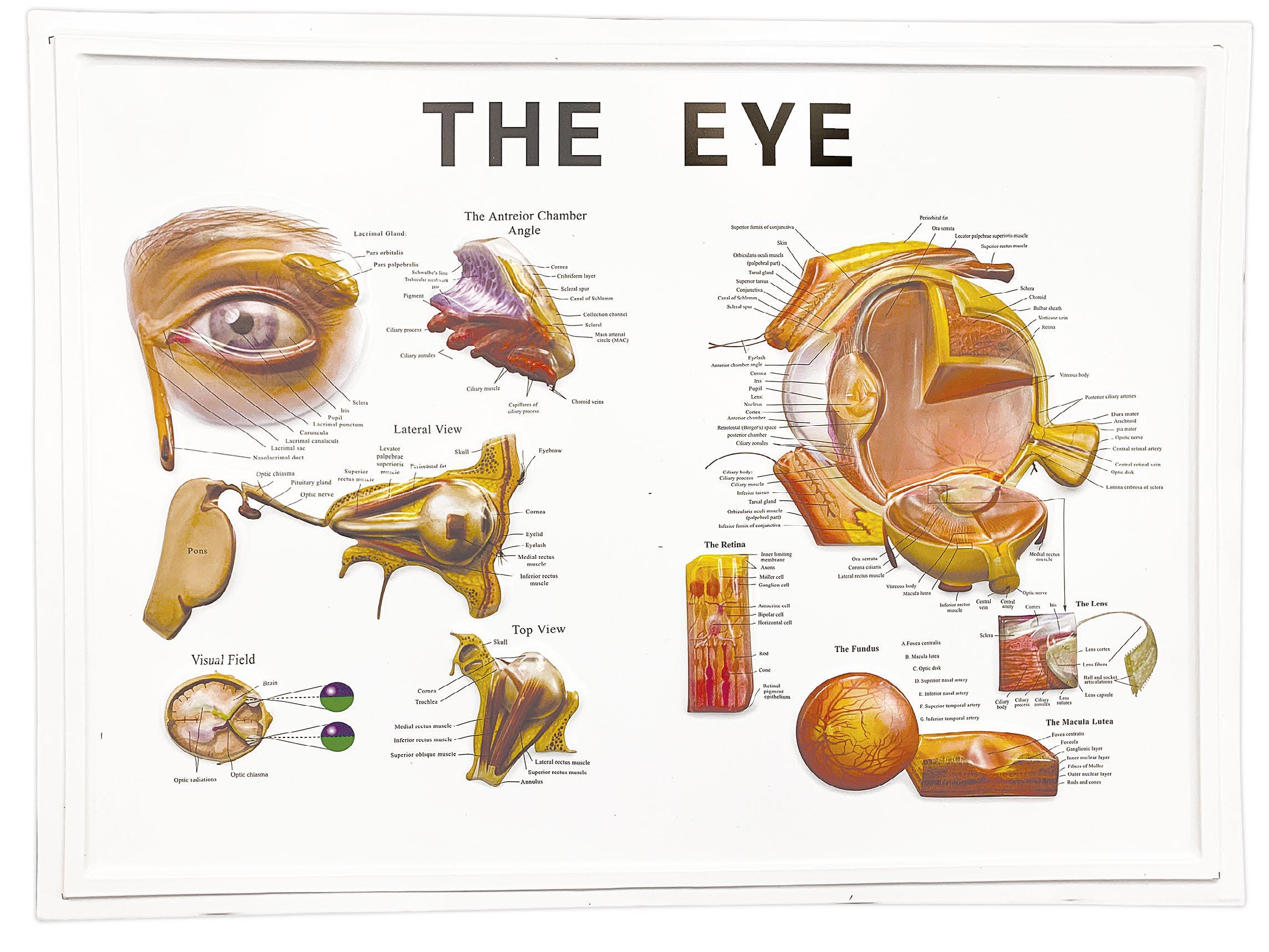 Poster raffigurante le varie sezioni dell'occhio tra cui muscoli, cristallino, nervo ottico, ghiandola lacrimale, retina, cornea, corpi ciliari etc.