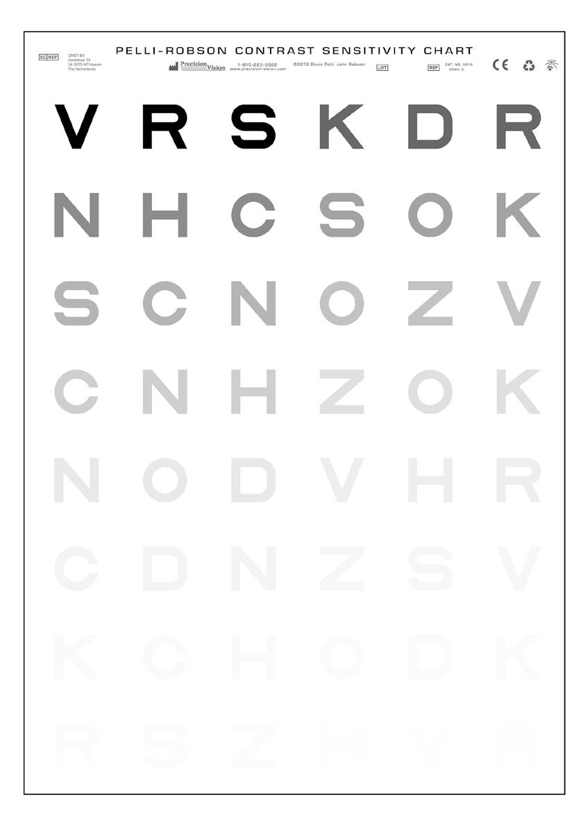 Il test di Pelli Robson è considerato il metodo più attendibile per la valutazione della sensibilità al contrasto. Il test non è alterato dalla retroilluminazione degli ottotipi digitali. La sensibilità al contrasto è una caratteristica fondamentale per il professionista che deve valutare persone con abilità visive carenti (Visione Sensibileipovisione), fornendo un dato utile anche per testare l’eventuale miglio-ramento della sensibilità al contrasto con filtri fotoselettivi.