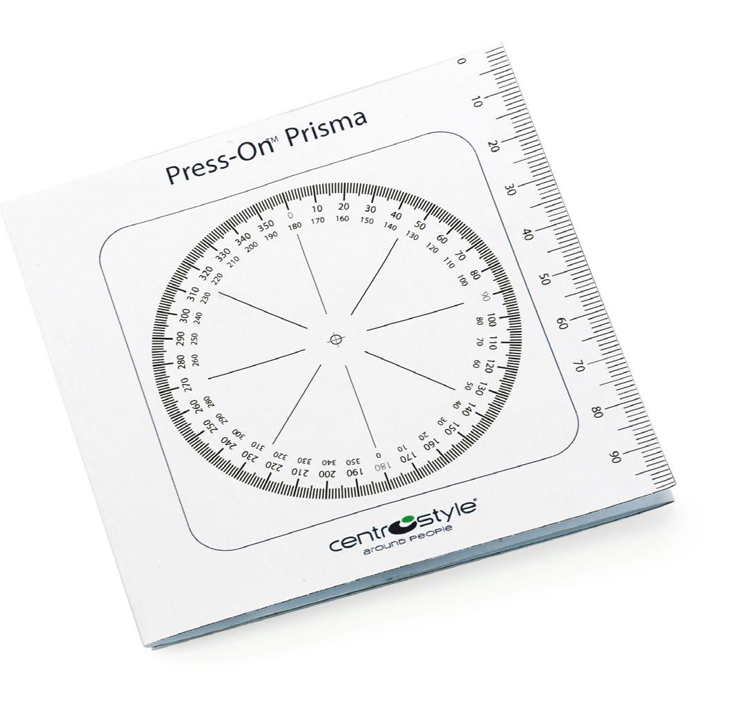 The prism’s lines are vertical. Real position of the word ‘BASE’ on the Press-On: Right eye: temporal, at the top, text vertical. Left eye: temporal, at the bottom, text vertical.