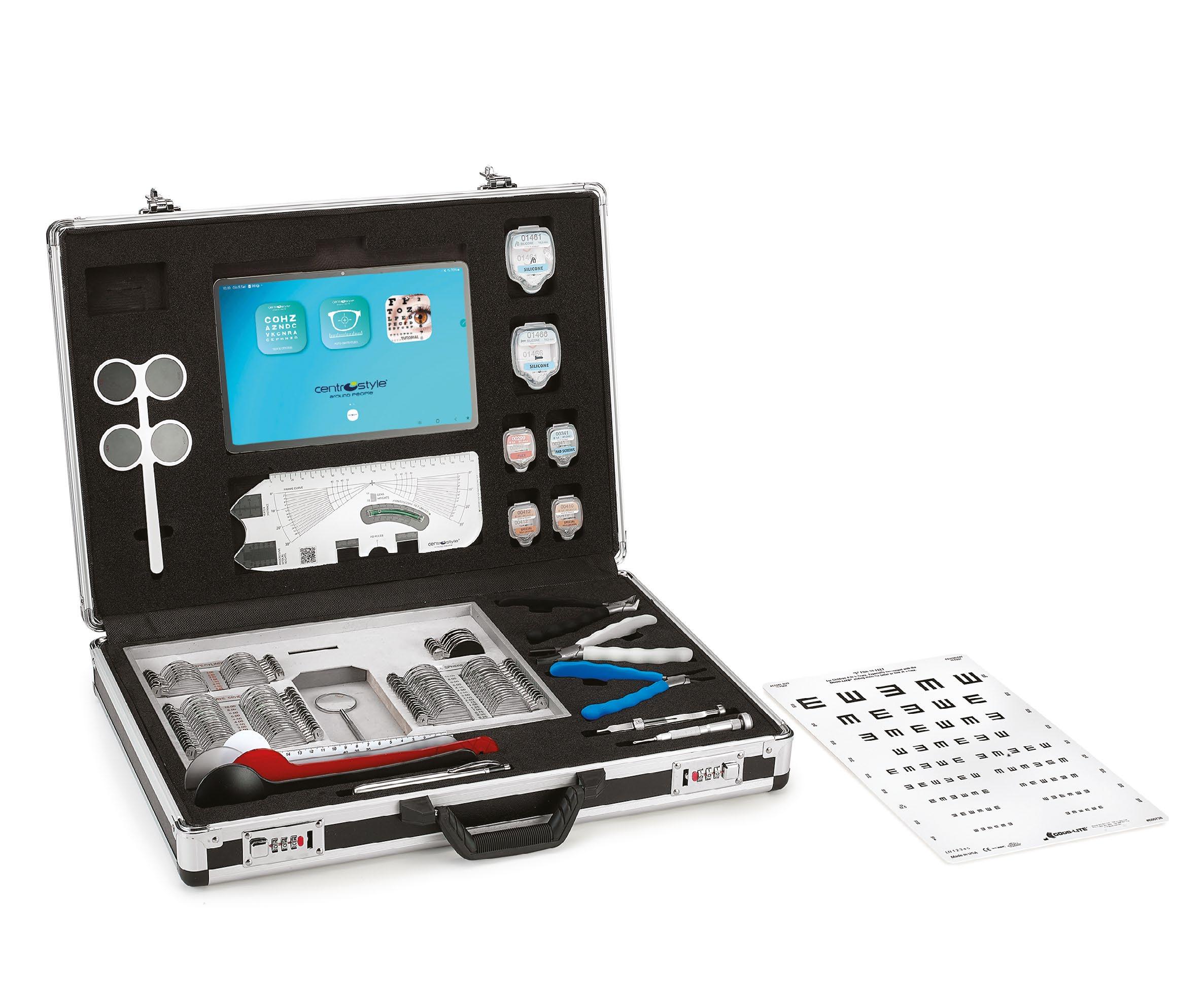 Designed to hold a selection of items ideal for an in-home visual exam or for screenings outside the office. It also contains eyewear maintenance and adjustment tools consisting of a selection of screws, nose pads, pliers and screwdrivers most used in daily practice.