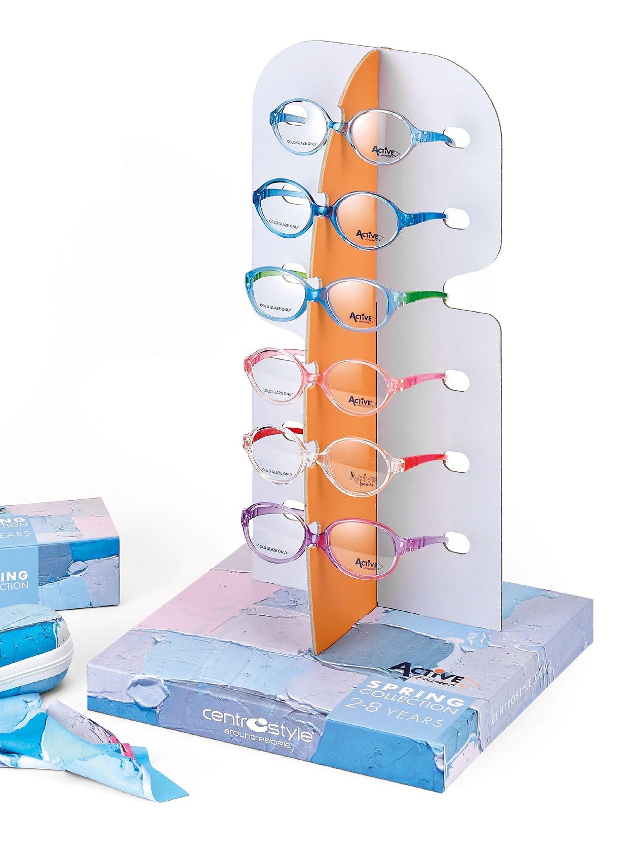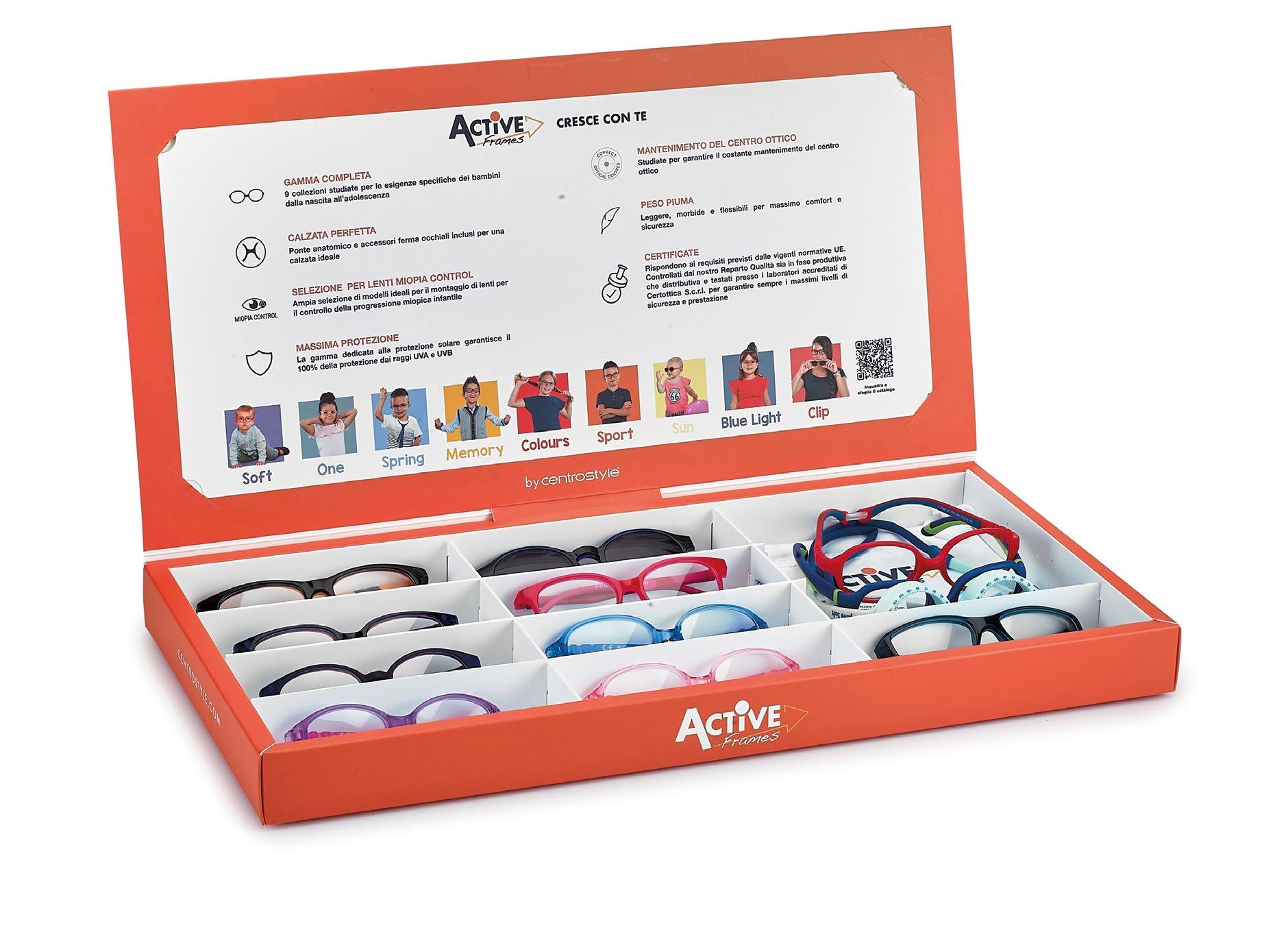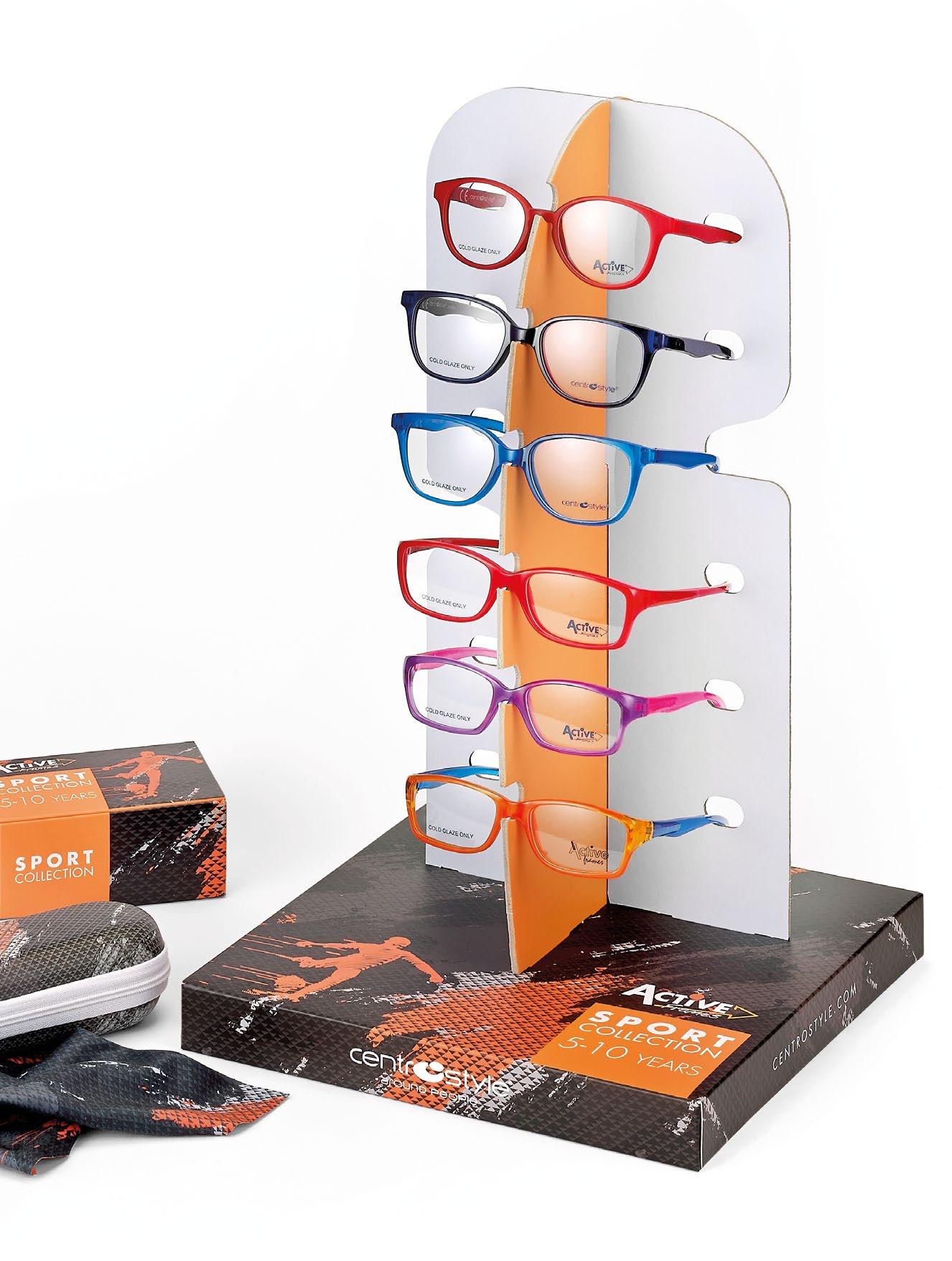 Espositori per la presentazione di montature Active, adatti sia per l’esposizione da banco che per la vetrina.