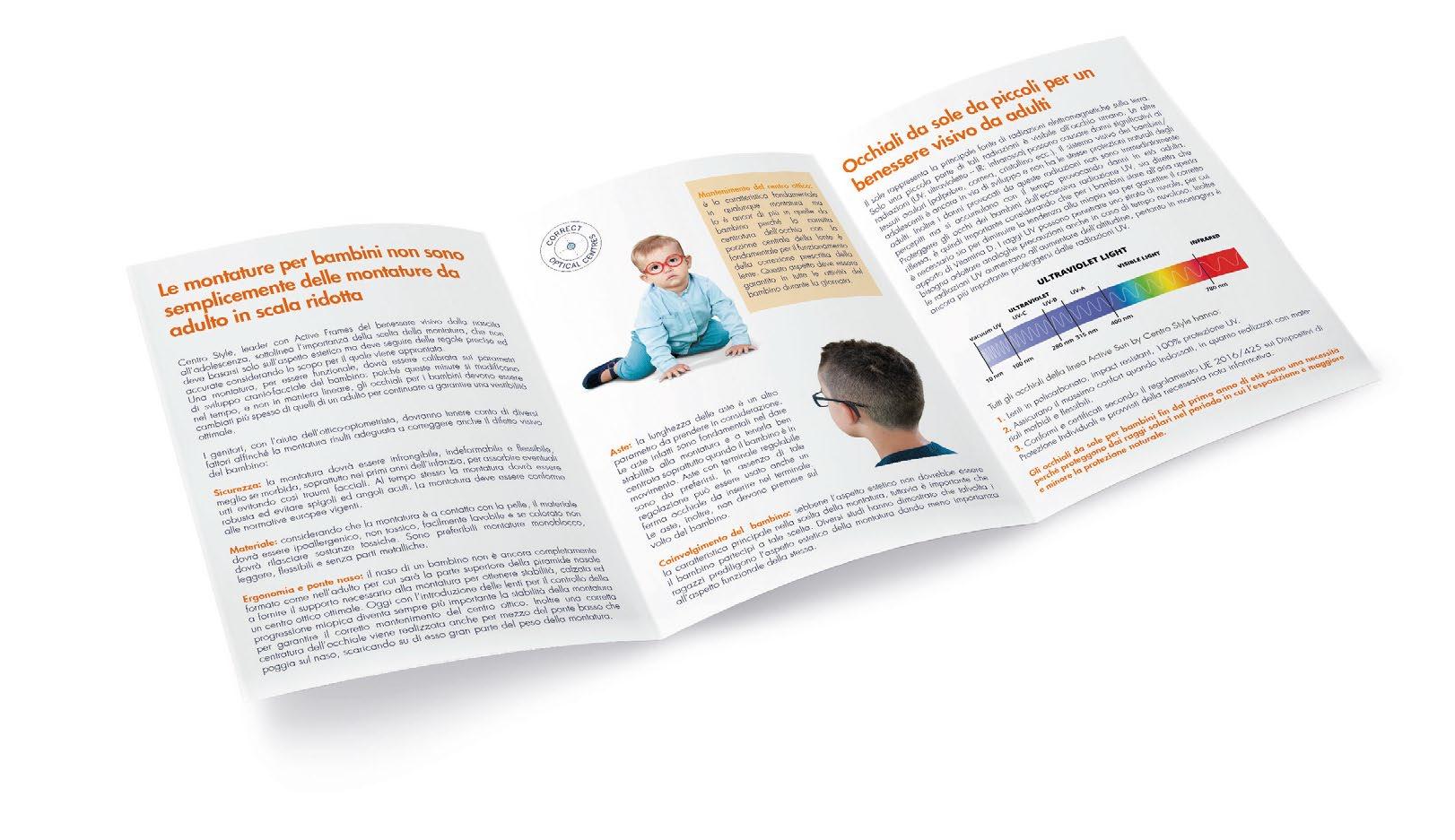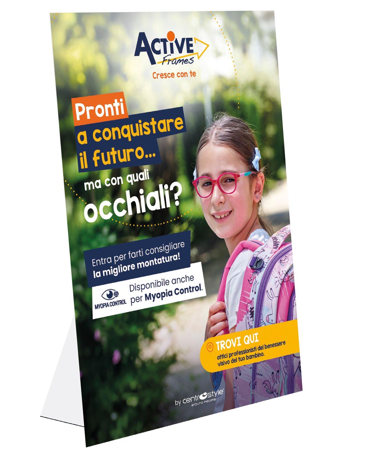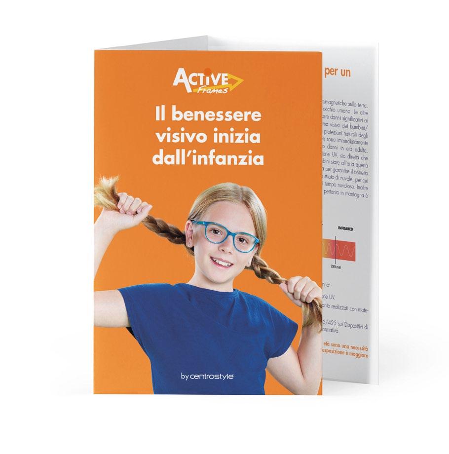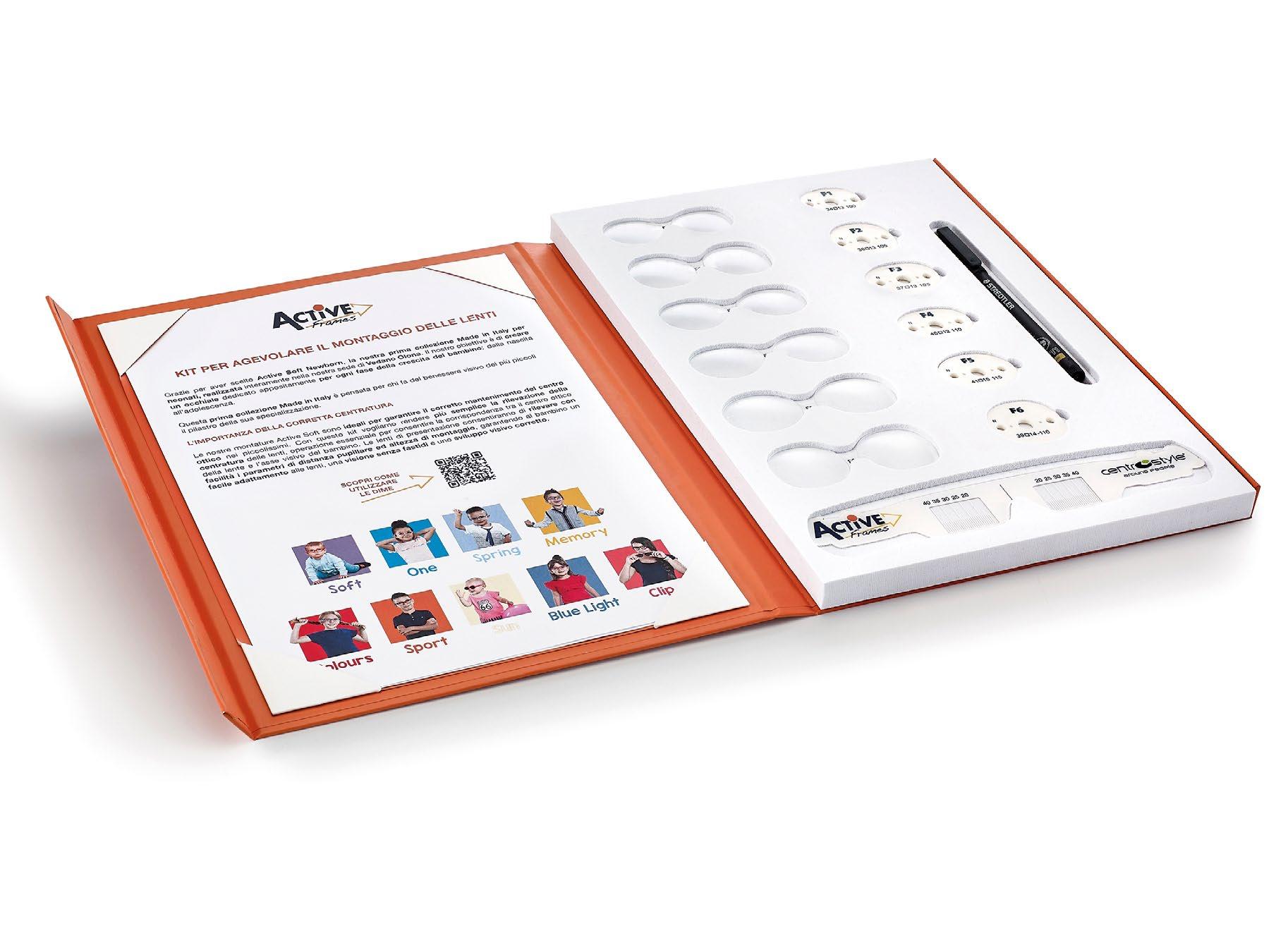 In omaggio con l’acquisto di 10 montature a scelta. Comprensiva di comunicazione riguardante i punti di forza comuni a tutte le collezioni. Dotata di uno spazio dedicato alle collezioni per la prima infanzia (Active Soft e One).