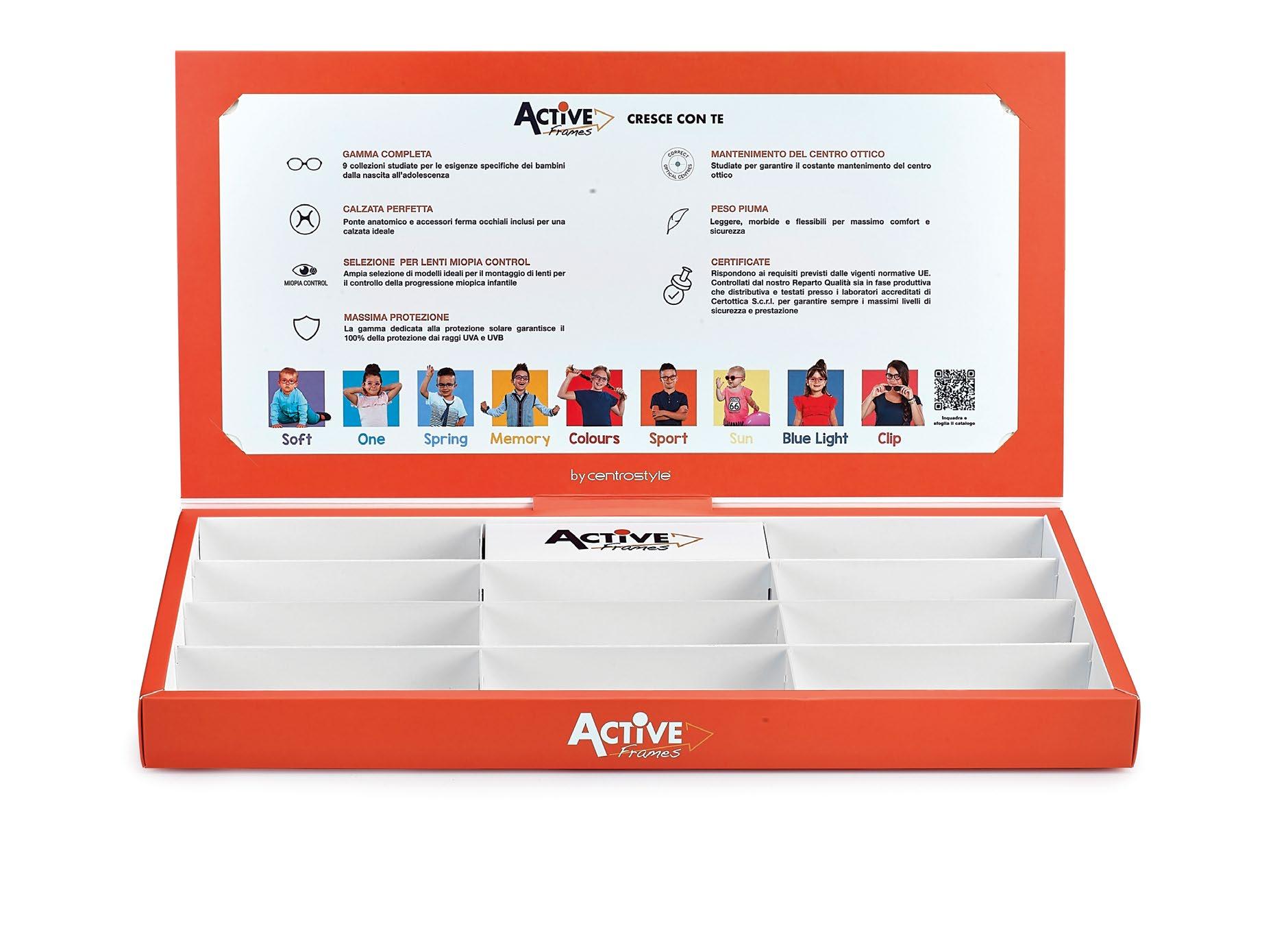 Couvette espositiva da 10 montature di cui una dedicata alle collezioni monoblocco Active Soft e One (48,4x24,5x4 cm)
