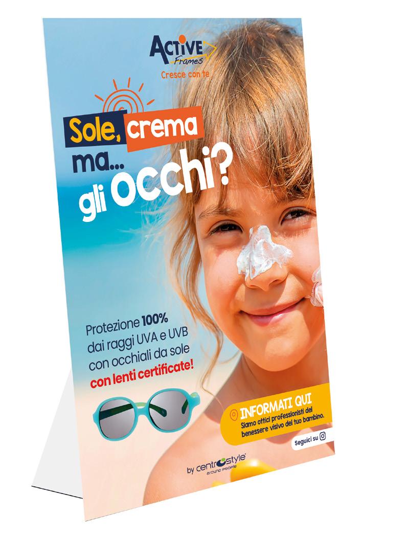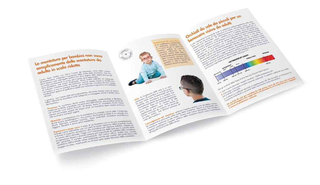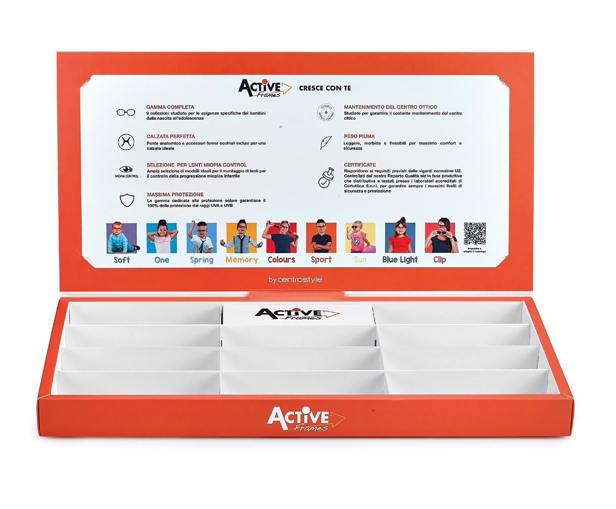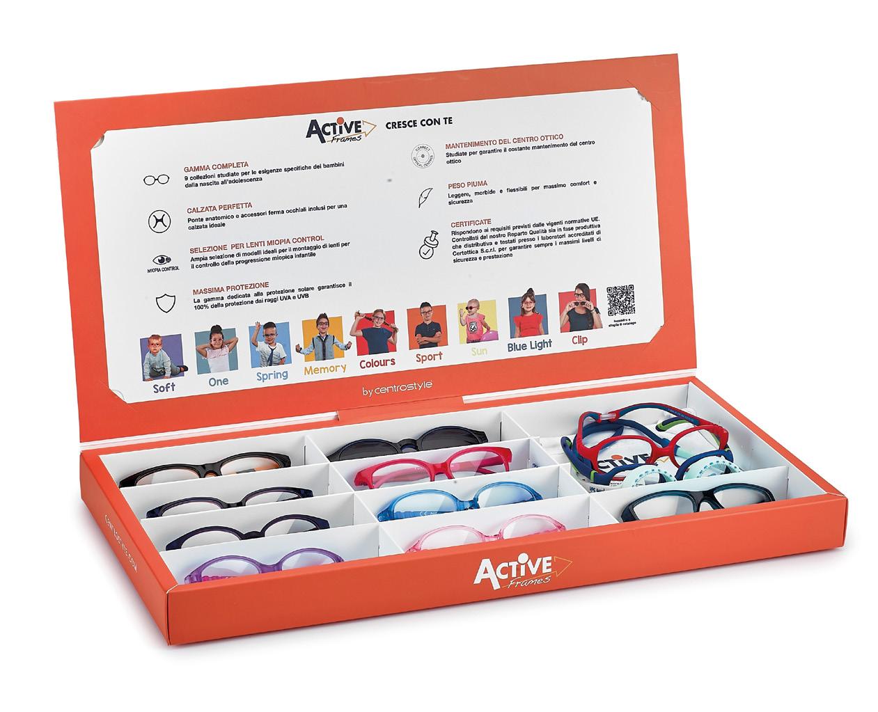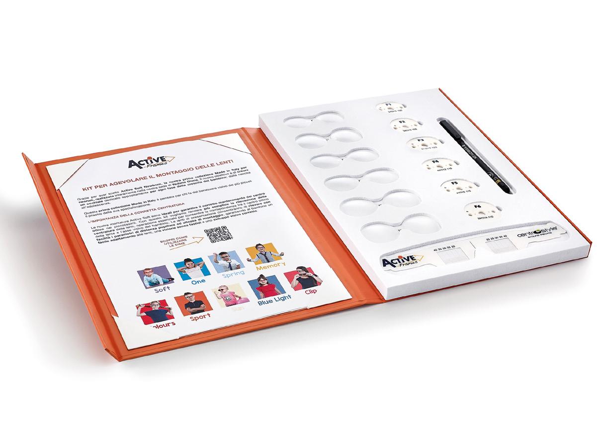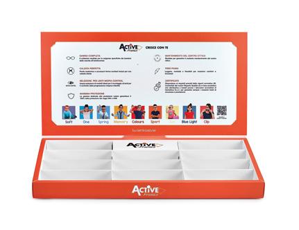 In omaggio con l’acquisto di 10 montature a scelta Comprensiva di comunicazione riguardante i punti di forza comuni a tutte le collezioni Dotata di uno spazio dedicato alle collezioni per la prima infanzia (Active Soft e One).