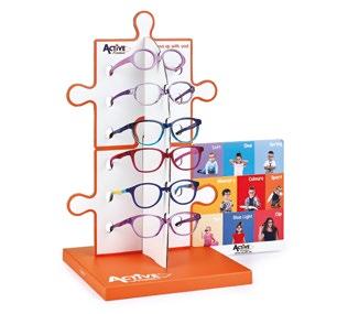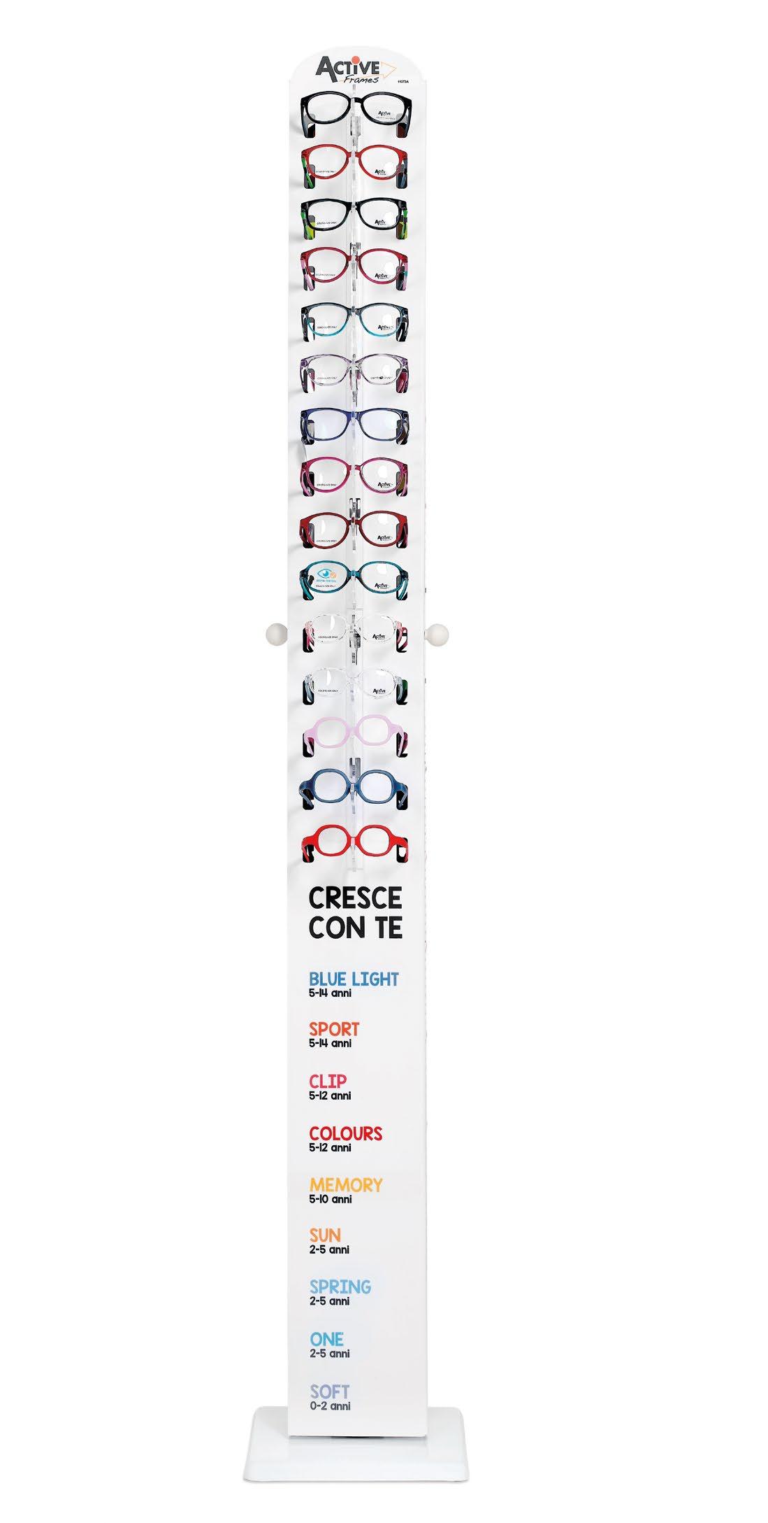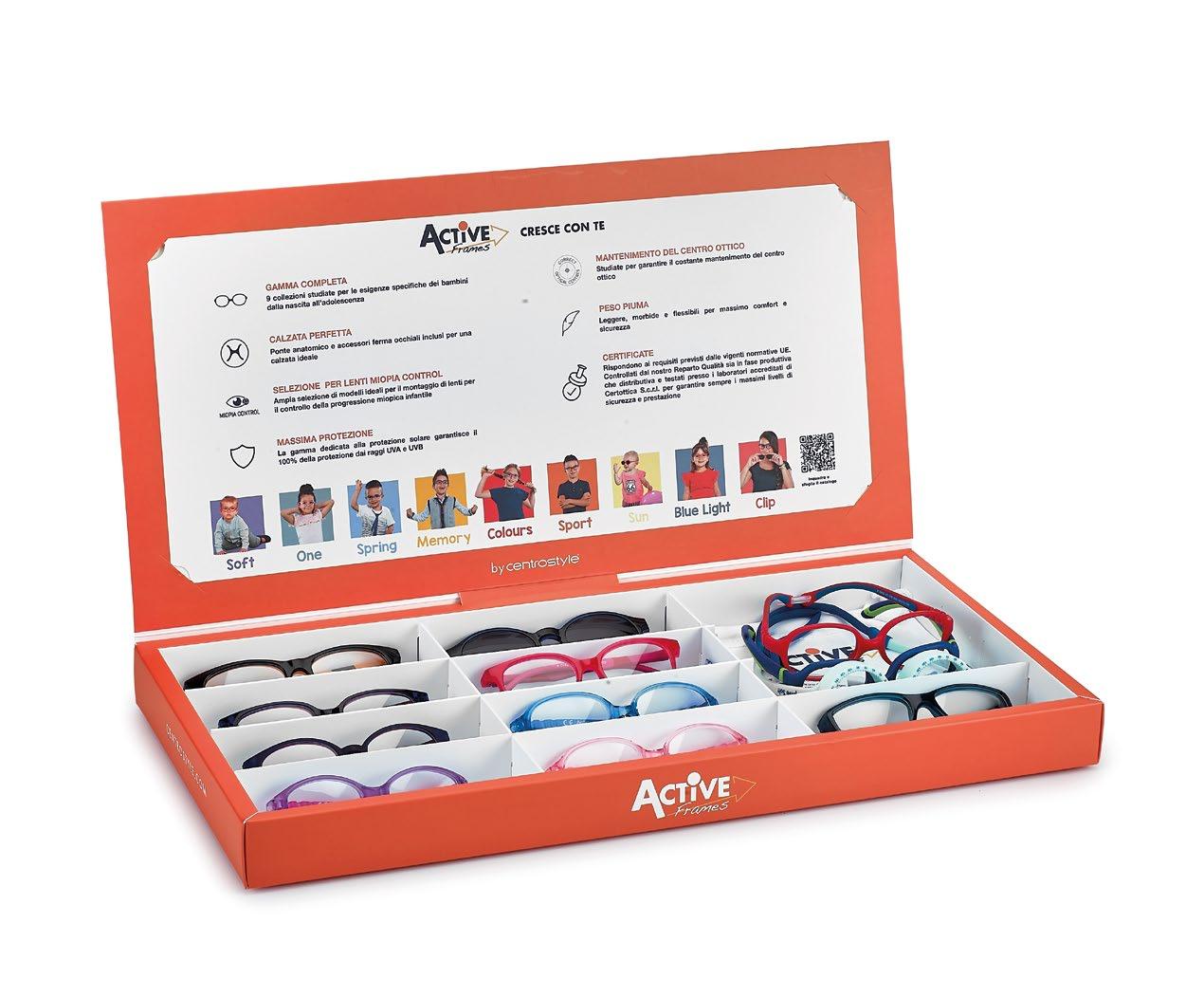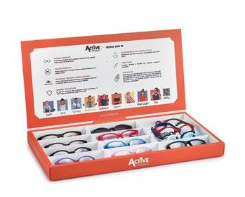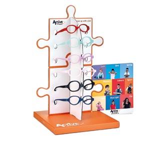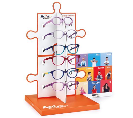 Espositori per la presentazione di montature Active, adatti sia per l’esposizione da banco che per la vetrina
