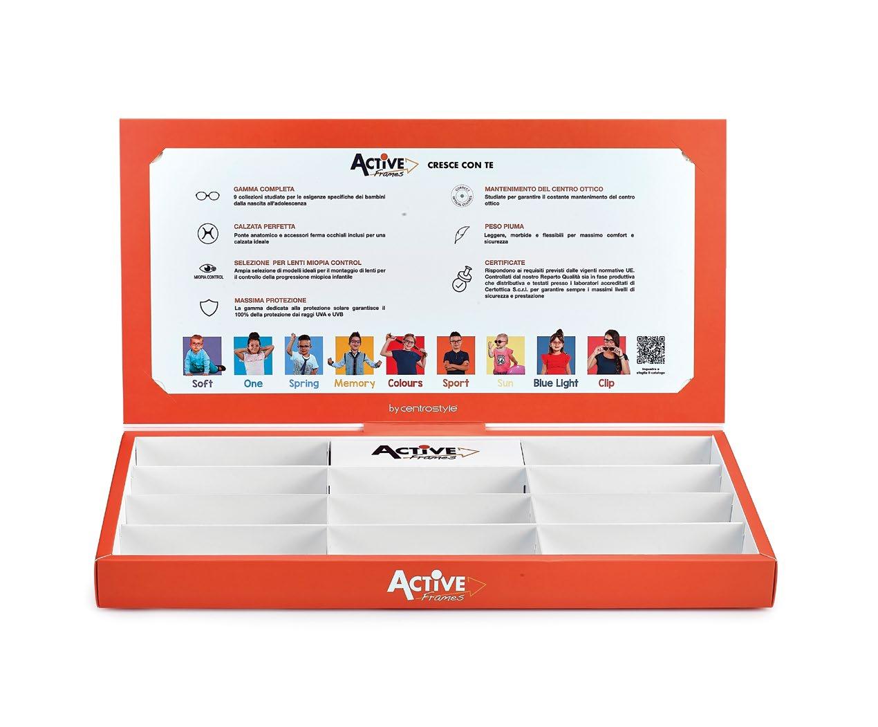 Couvette espositiva da 10 montature di cui una dedicata alle collezioni monoblocco Active Soft e One (48,4x24,5x4 cm)