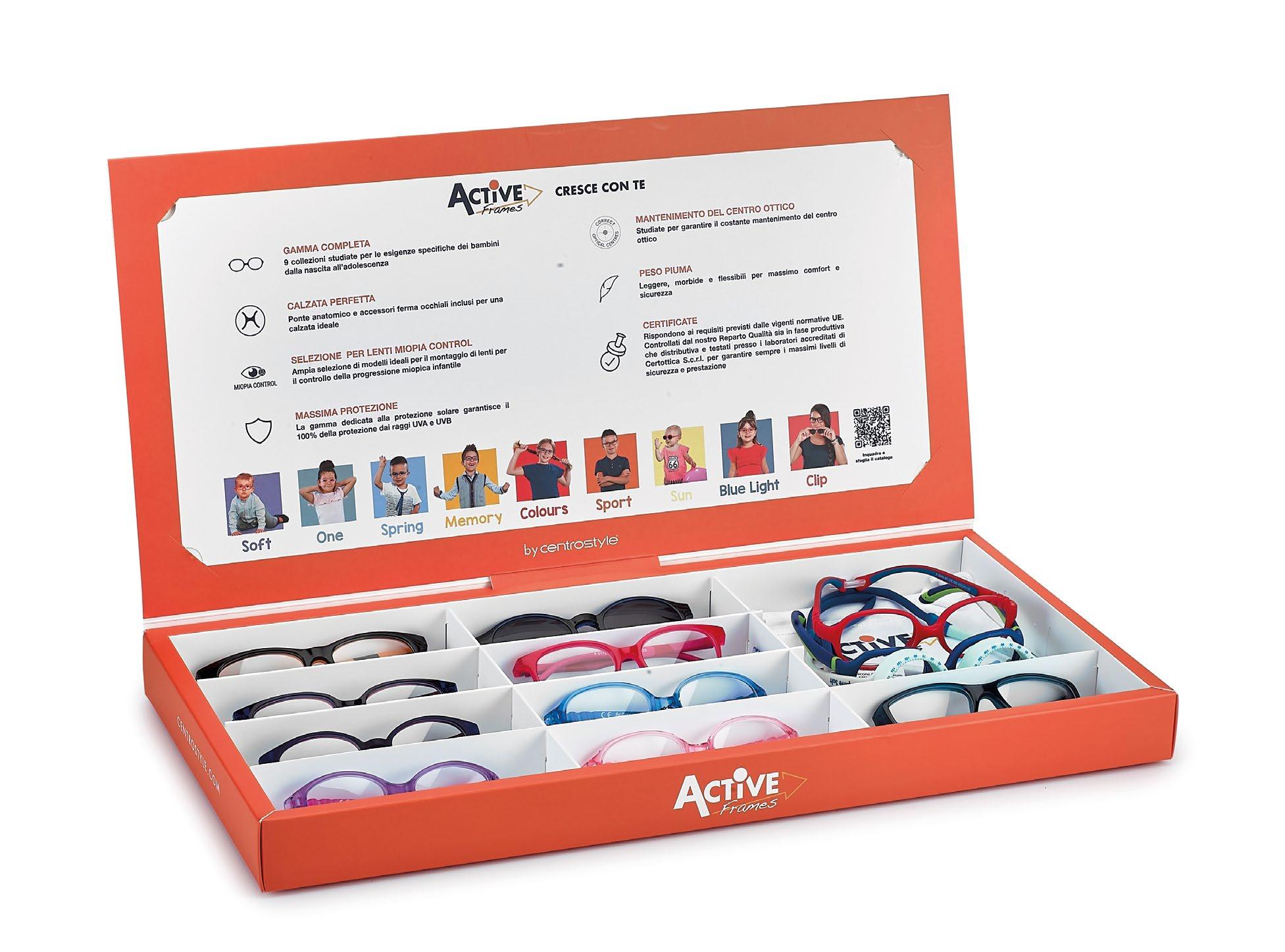 In this phase of life, eyewear begin to define one’s own style, a way of being, becoming a real element of self-definition. This is why the Active Frames aim here to combine the maintenance of the optical centre with aesthetic qualities that recall those of the adult. The breadth of shapes and decorations available to the adolescent becomes fundamental.