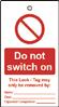 Designed to be placed directly on the lock shackle through the tag. Double-sided and supplied packs of 10. Complete with eyelet for use without a tie wrap.