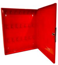 Red powder coated steel padlock cabinet with interior racks for the storage of padlocks.