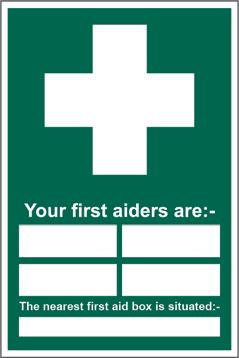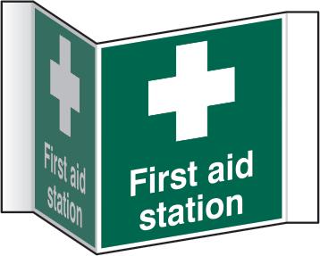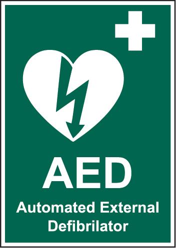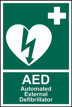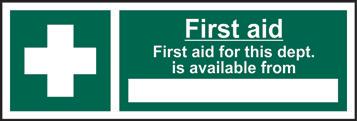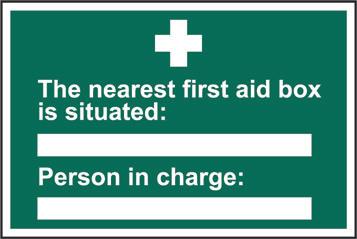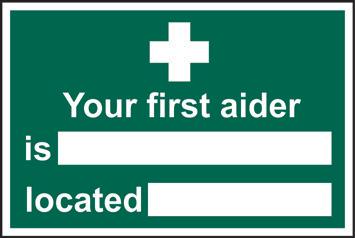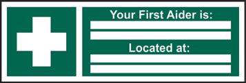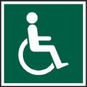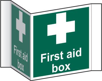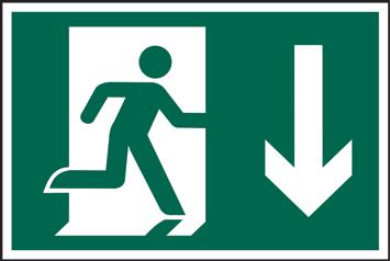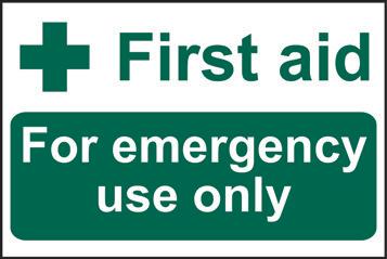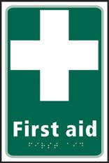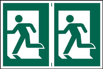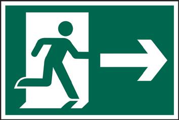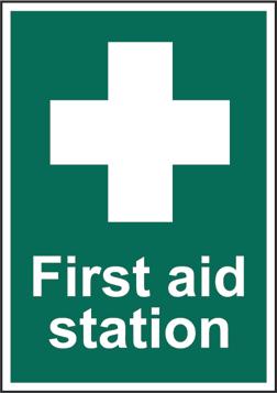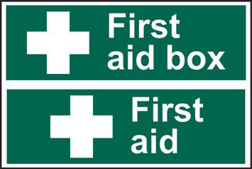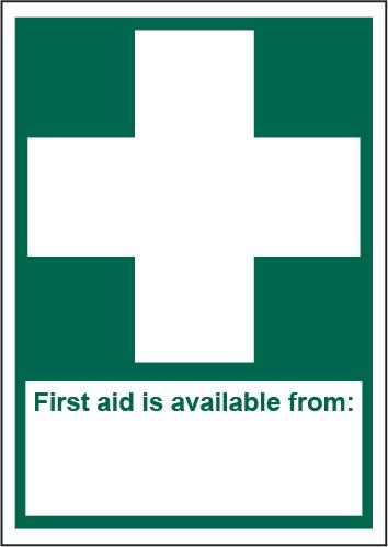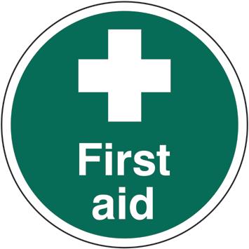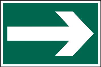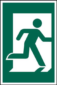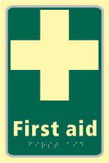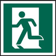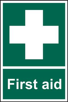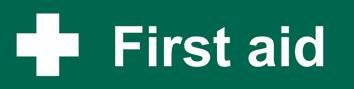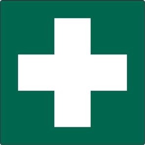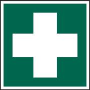 A green rectangle or square with a symbol or text in white providing information about first aid, escape or other safe conditions.