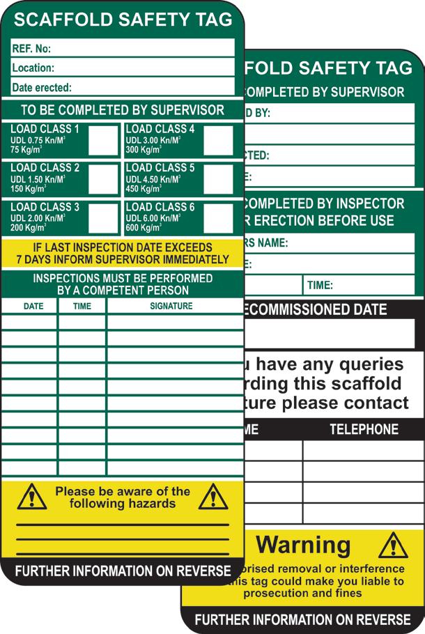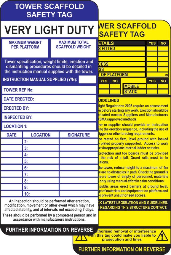 The Tower Scaffold Safety Tag provides an essential platform for entering and storing essential safety information, including movements and safe weight tolerances. Designed for use with the ClawTag holder, these tags can be fixed to the scaffold after erection without needing to dismantle part of the structure.