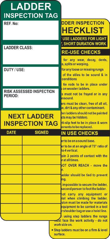 All ladders should be checked daily and prior to use for any damage, faults or wear and tear. In addition they should be inspected at defined intervals as part of a risk assessment programme. Use these inserts to manage the identification, safety, maintenance of ladders and help conform to the Work at Height Regulations 2005.