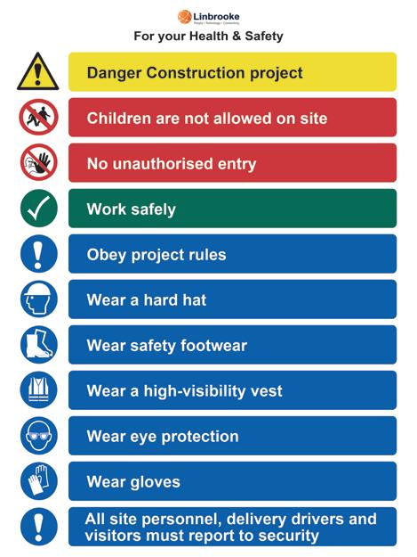 Linbrooke signage catalogue has been developed to ensure that our visual branding is clearly and consistently applied across all worksites as well as to comply with site safety regulations.