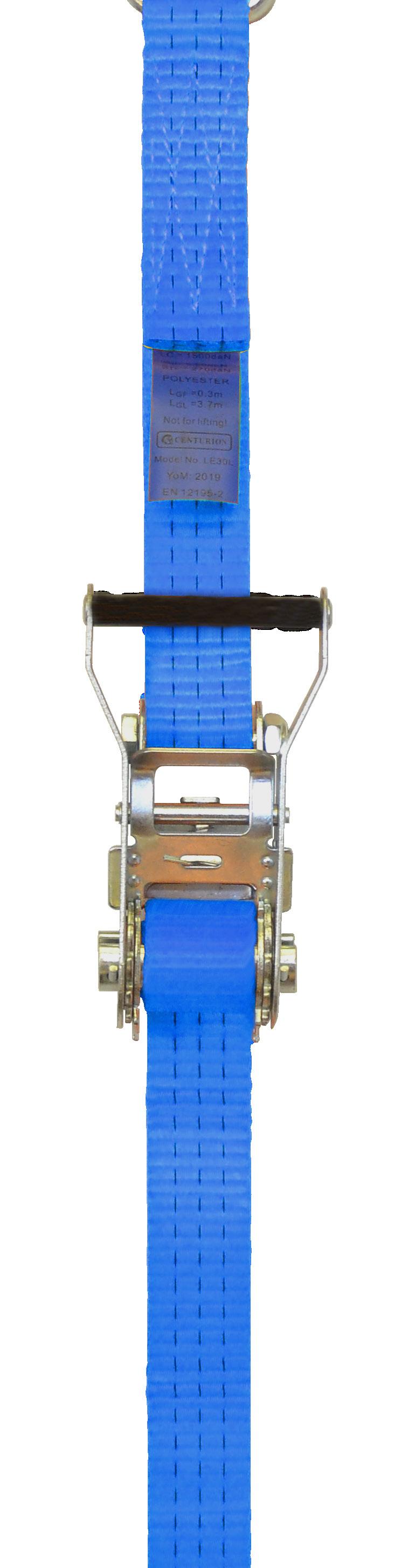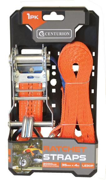 quality 35mm PES webbing Strengthened spring gear with easy release mechanism HEAVY DUTY RATCHET STRAPs RATCHET STRAPs PACK SIZE: 1 Pack CATEGORY: Heavy Duty STRAP WIDTH: 35mm STRAP LENGTH: 4m BREAKING STRENGTH: 2000kgs STANDARD: EN 12195-2 PRODUCT SPEC LE30P PACK SIZE: 1 Pack CATEGORY: Heavy Duty STRAP WIDTH: 35mm STRAP LENGTH: 6m BREAKING STRENGTH: 2000kgs STANDARD: EN 12195-2 PRODUCT SPEC LE31P • Easy and convenient to use • Provides enough leverage to make fastening even the heaviest equipment easy • One hand tightening • High quality hardware and PES webbing • Provides strength ratings up to 2000kgs • Claw Hook made from high grade zinc plated steel KEY FEATURES LC = 1000daN SHF = 50daN STF = 280daN POLYESTER LGF = 0.3m LGL = 3.7m Not for lifting Model No. LE30P YoM: 2019 EN 12195-2 Production date European norm Order code Reference Manufacturer Warning Webbing Material Standard hand force Loading Capacity Length of fixed end Length of long end Standard tension force ratchet Strap Label Its a legal requirement to clearly detail the straps capabilities, without this label the straps are not legally allowed to be used. All Centurion’s ratchet straps feature this label. Ratchet strap label for safety