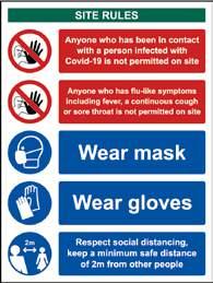 15 SCHOOL SAFETY RULES During this time it’s important to communicate your school rules for staff, parents, carers and visitors. These multi message site safety notices pull together key instructions related to Covid-19. Available in non adhesive rigid PVC and 3mm Foamex Board. SITE RULES SAFETY SIGN These multi message site safety notices pull together key instructions related to Covid-19. Available in non adhesive rigid PVC. Ref Description Material Size Code Pk A 2m - Social Distancing & Hygiene Safety Sign RPVC 400 x 300mm 5505701 1 B 2m - Covid-19 Reception Safety Notice RPVC 400 x 300mm 5550701 1 C 2m - Covid-19 Workplace Safety Sign RPVC 400 x 300mm 5556601 1 D Keep a safe distance - Social Distancing & Hygiene Safety Sign RPVC 400 x 300mm 5572401 1 E Keep a safe distance - Covid-19 Reception Safety Notice RPVC 400 x 300mm 5562901 1 F Keep a safe distance - Covid-19 Workplace Safety Sign RPVC 400 x 300mm 5574601 1 Description Material Size Code Pk Safety Rules RPVC 300 x 400mm 55A2501 1 Safety Rules FMX 600 x 800mm 55A2601 1 SCHOOL SAFETY RULES Do not enter premises if you are displaying symptoms of Coronavirus, or been in contact with anyone with symptoms Please adhere to any allocated drop off / collection times Please do not gather at entrances, gates and doors Do not enter site unless you have a pre-arranged appointment Cover coughs and sneezes and dispose of tissues responsibly / take home with you Wash or disinfect your hands Respect social distancing keep a safe distance from others Only one parent / adult to accompany child to setting Respect social distancing, keep a safe distance from other people Respect social distancing, keep a safe distance from other people Respect social distancing, keep a safe distance from other people D E F A B C