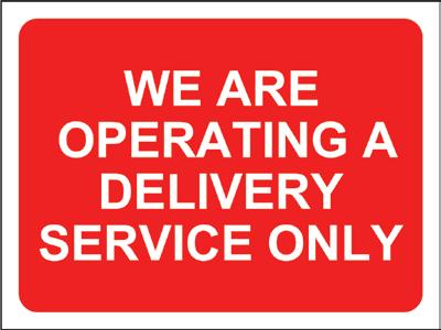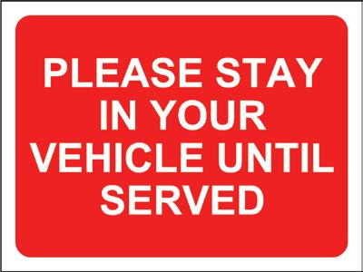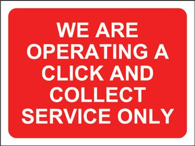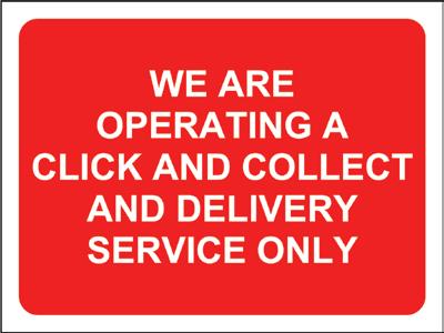 Description Colour Size Code Pk Please stay in your vehicle until served Red 600 x 450mm STP600 1 We are operating a click and collect and delivery service only Red 600 x 450mm STP601 1 We are operating a click and collect service only Red 600 x 450mm STP602 1 We are operating a delivery service only Red 600 x 450mm STP603 1 Please wait here until called forward Red 600 x 450mm