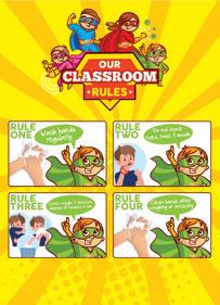 Create class safety rules for children to follow, as a visually appealing poster including washing hands regularly, covering coughs and sneezes.